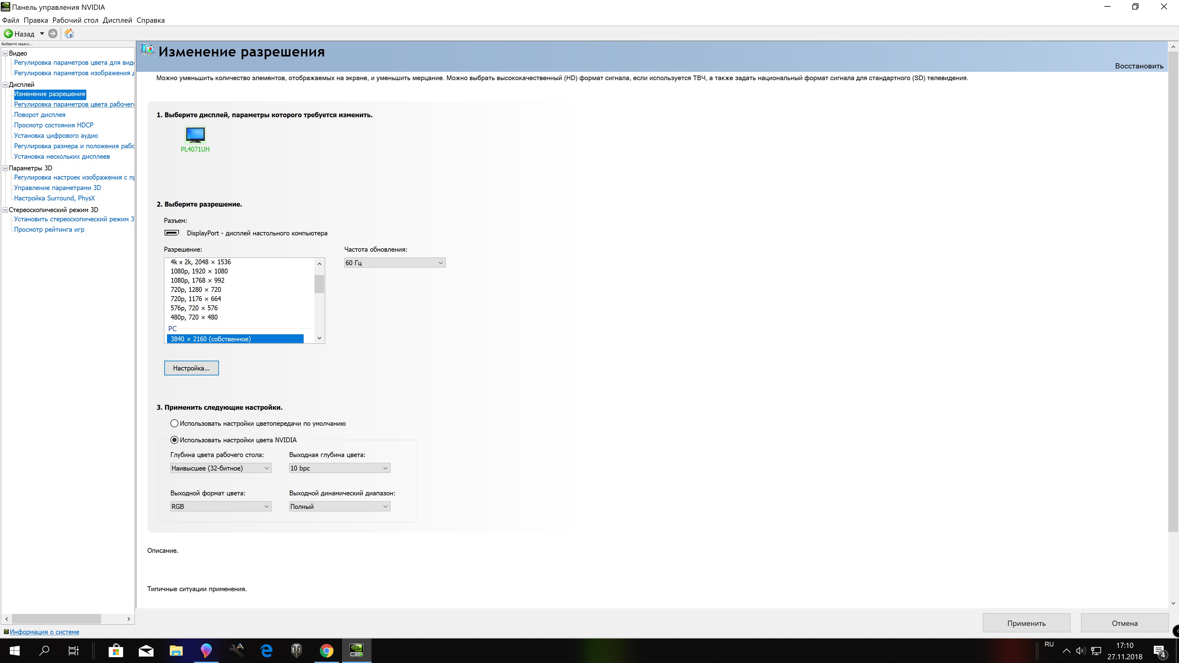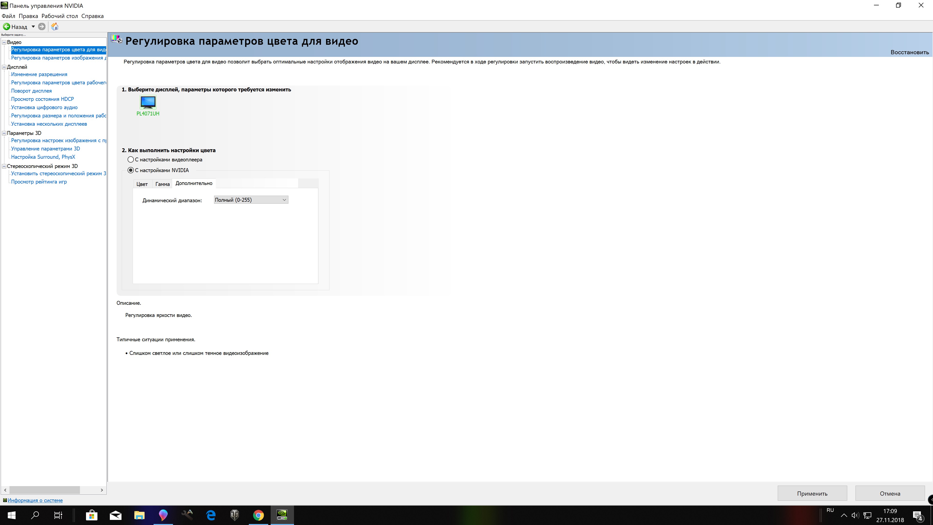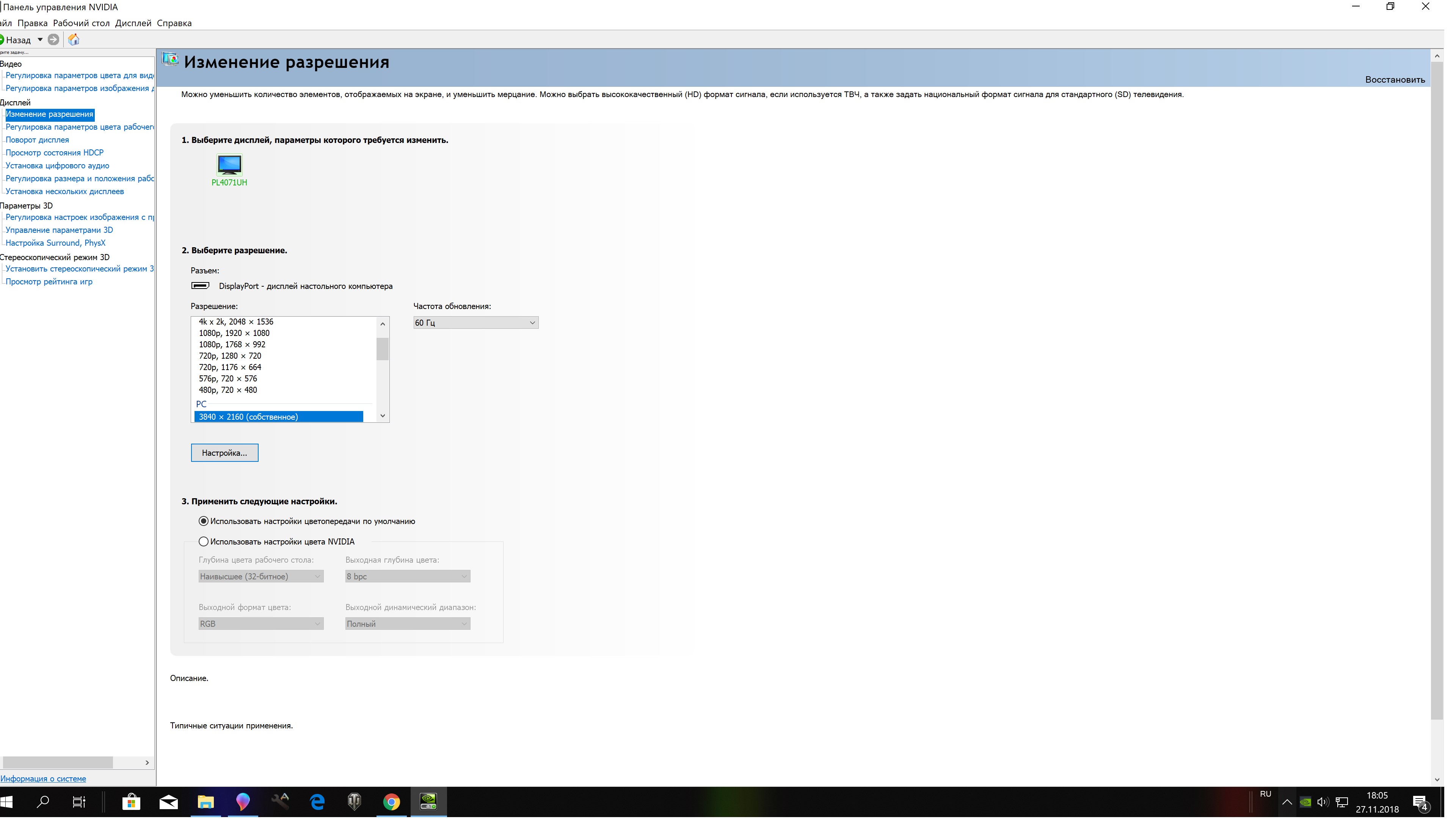 в вкладке изменить разрешение я вообще ничего не трогал) все по умолчанию,помню до какого то драйвера выставляло на автомате 8 бит полный а потом нормально стало,единственное что постоянно меняю это 0_255 он ставит ограниченный я на полный ну у меня дп подключение может из за этого у меня все в норме,хотя может вру щас проверю что по умолчанию )