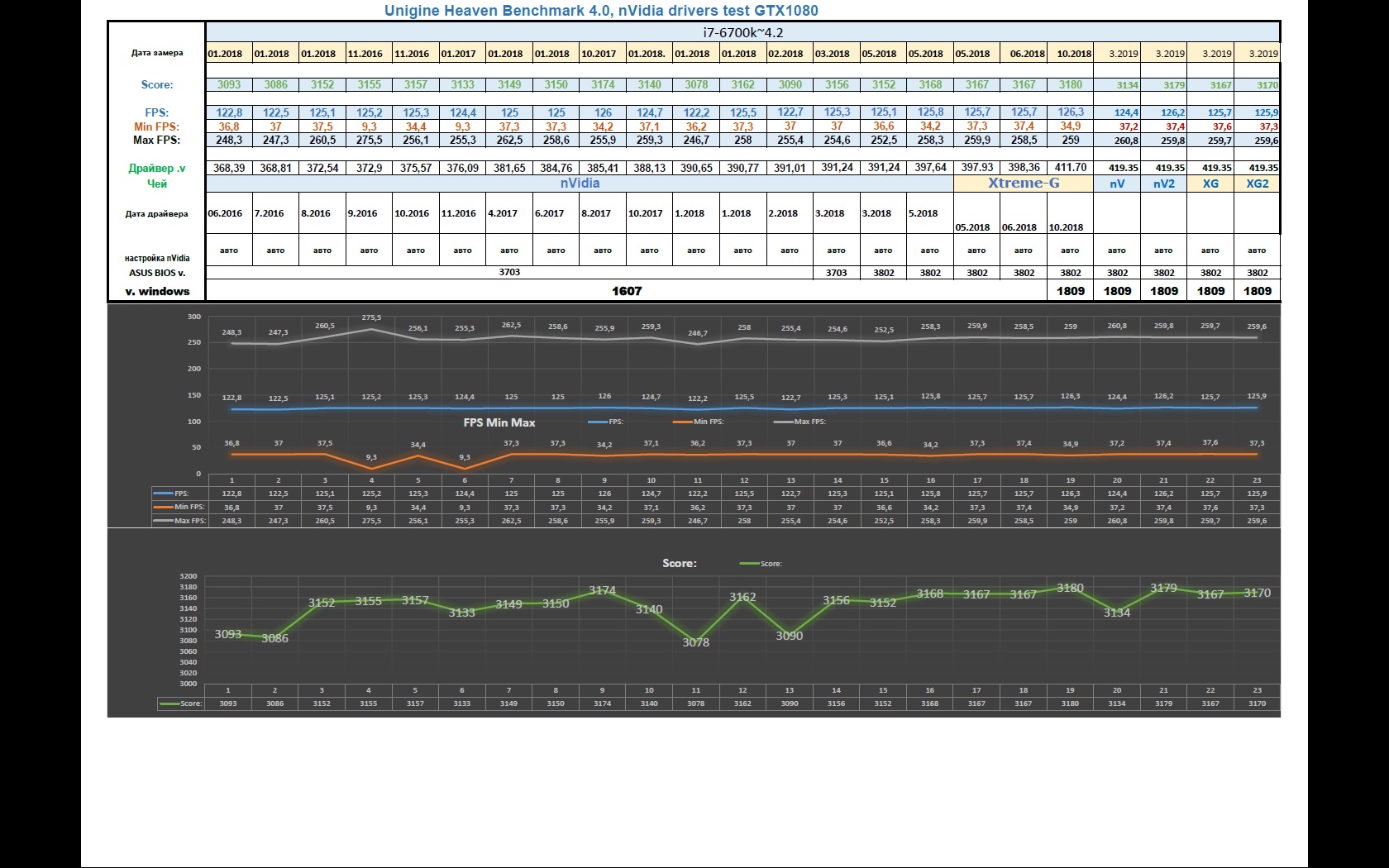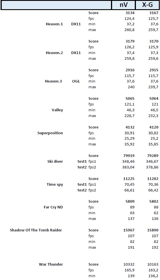 Настройки драйвера nVidia -Согласно 3D приложению, электропитания ОС - Максимальная производительность. В Бэнчах : Брался средний результат по Score, с максимальными настройками в 1680х1050. Heaven DirectX11 прогонялся 2 захода по 3 раза. Взят один из среднего результата, но меньший ( оба средних в первой таблице - nV1, nV2 и XG1, XG2). Heaven OGL- средний из 3х прогонов. Valley - средний из 3х прогонов. Superposition - средний из 3х прогонов. Preset Extreme 1920x1080 Ski diver* и Time spy – взяты наибольший из 2х прогонов- разрешение системное, настройки макс. *Sky diver (правильное название) - в таблице опечатка - сорян!