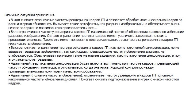 Ещё раз про режим быстро Вот как описывает сама нвидиа этот режим в хепле настроек • Быстро: снимает ограничение частоты рендеринга кадров ГП, как при отключенной синхронизации, но не вызывает разрывов изображения, так как кадры, превышающие частоту обновления дисплея, не отображаются. Говоря простым языком, карта будет молотить у вас максимальное кол-во кадров, как и при отключении синхронизации, но не будет отображать у вас их просто по сравнению с ним. Хотя счётчик и будет показывать их большее кол-во, как и при отключённой синхронизации. Тест выше уже приводил как на директx11 играх, так и на директx9. К тому же в играх на директх 11 игре как я понял плевать на ваши настройки синхронизации в драйверах. И игра руководствуется исключительно настройками в себе. Тестил на Windows 7 Sp1 x64 Pro. Ну и в заключении вот вообще про режимы синхронизации в драйверах от самой Nvidia.