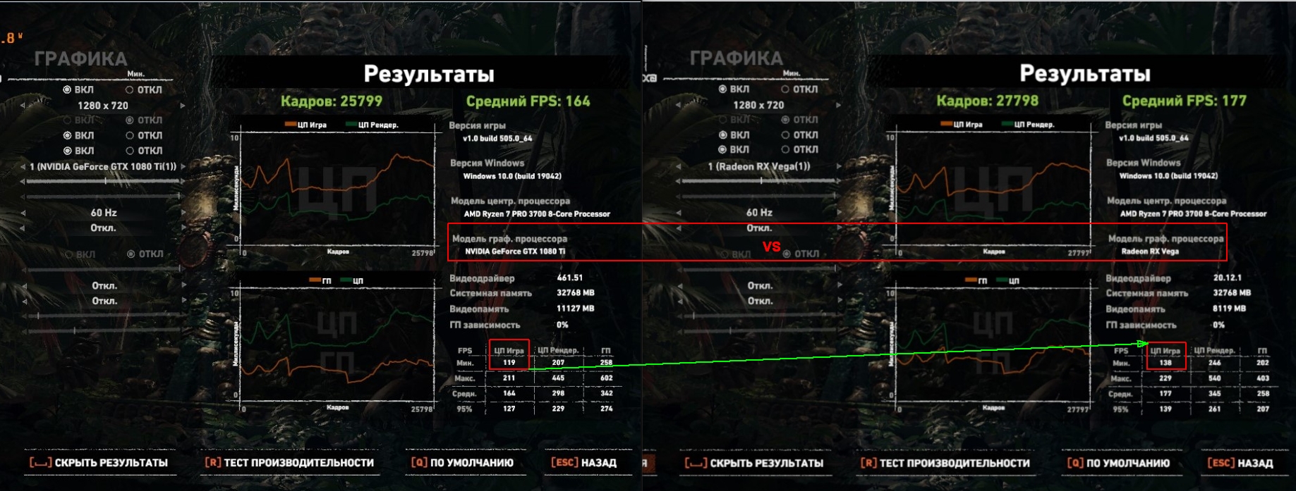 ну я считаю так: цп рендер - скоко может дать проц, а ЦПигра сколько подсистема памяти(того же проца+ плашек памяти) по типу, как здесь( 94фпс vs 132фпс) by Aurosonic(но тут версия лары тормозная, но для сравнения при прочих равных vs частота памяти пойдёт ) или вот ещё https://youtu.be/HcW8mTLq3uQ?t=704 i9-11900K 1:2 vs 1:1 например