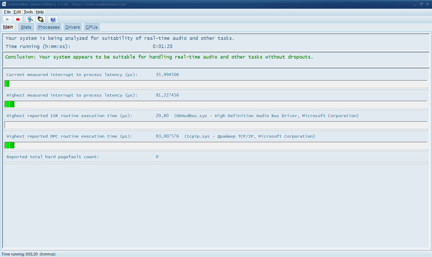 _________________________________________________________________________________________________________ CONCLUSION _________________________________________________________________________________________________________ Your system appears to be suitable for handling real-time audio and other tasks without dropouts. LatencyMon has been analyzing your system for 0:01:00 (h:mm:ss) on all processors.