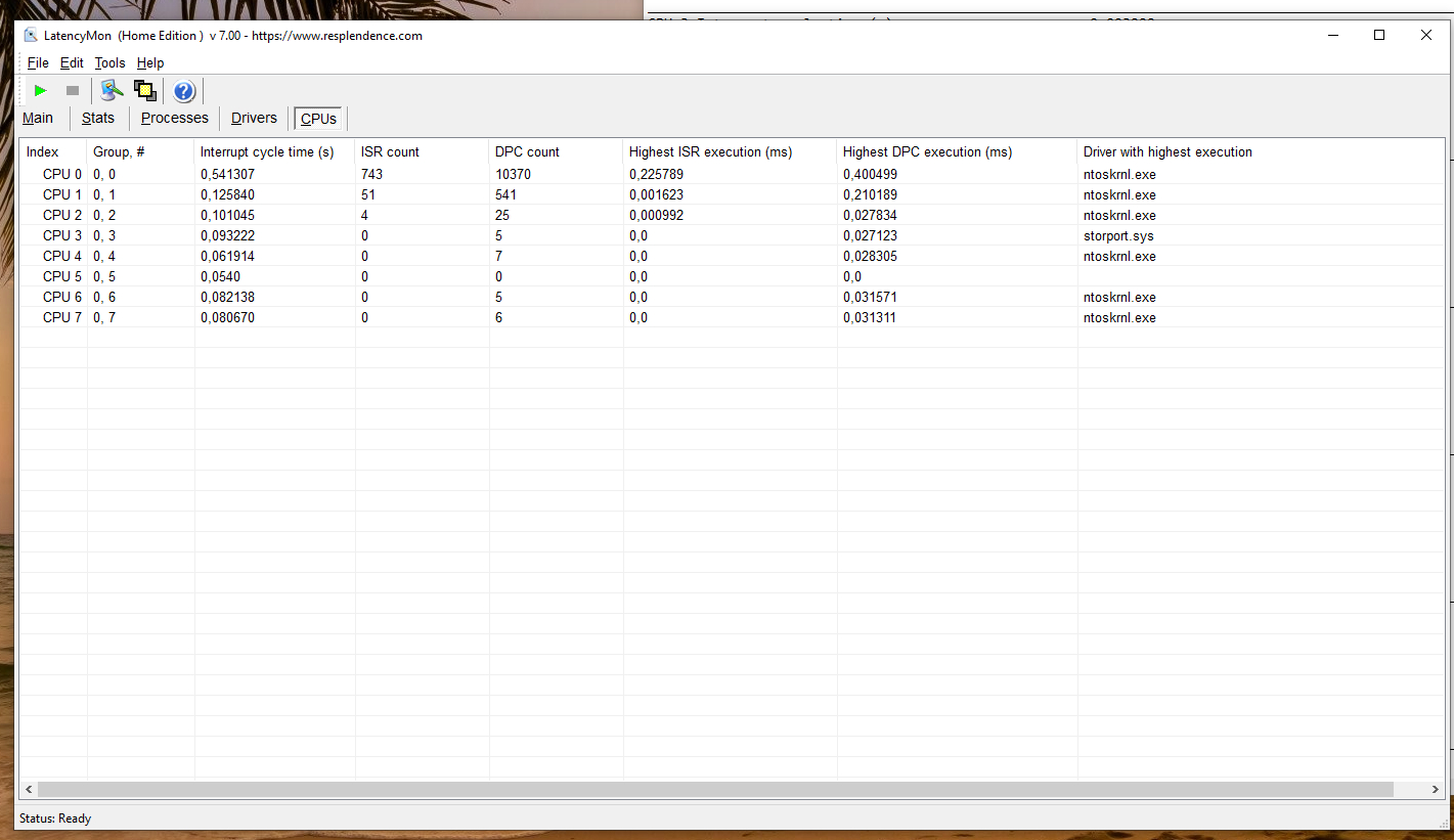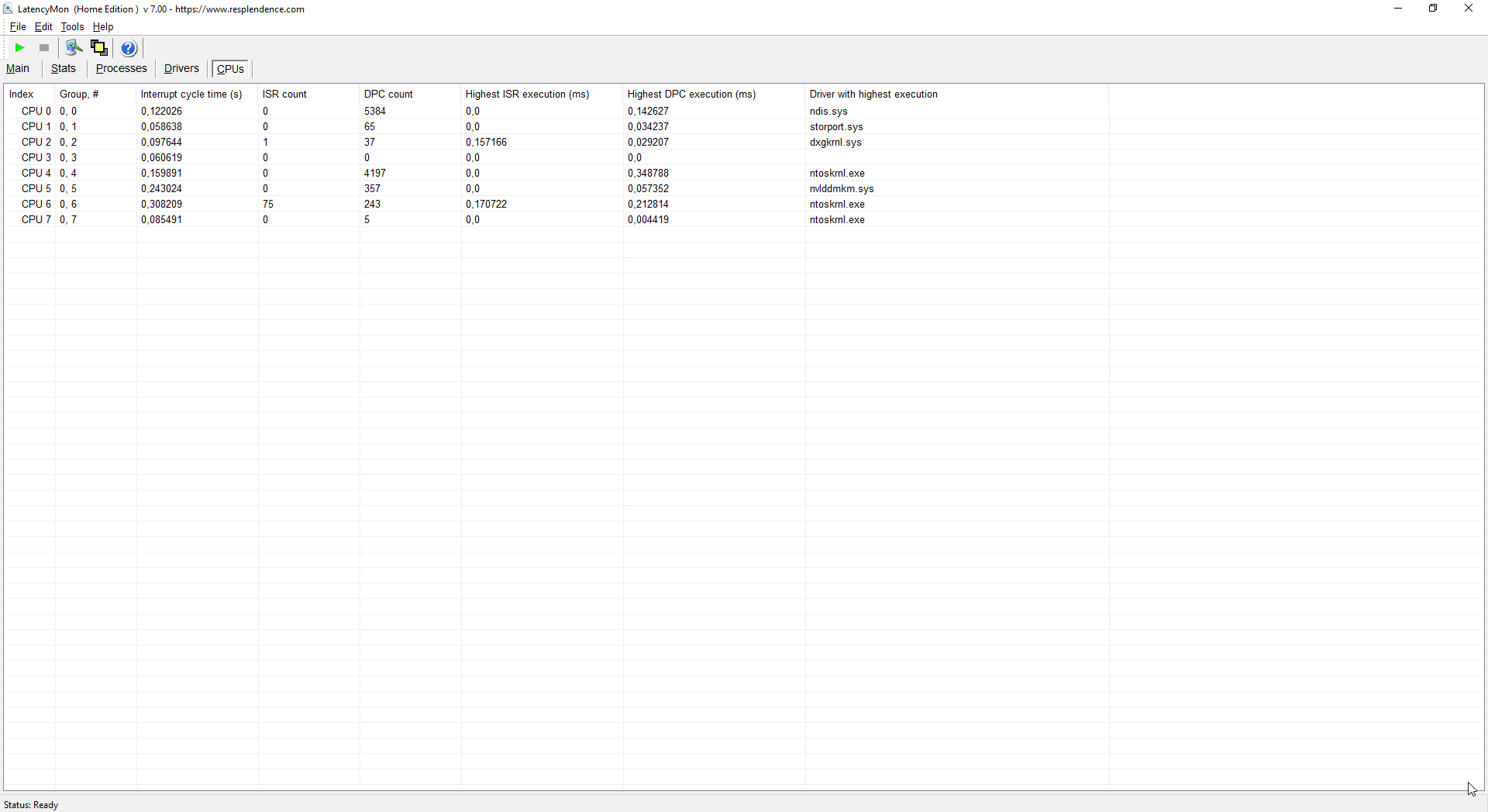 Highest reported total ISR routine time (%): 0,013633 Driver with highest ISR total time: dxgkrnl.sys - DirectX Graphics Kernel, Microsoft Corporation