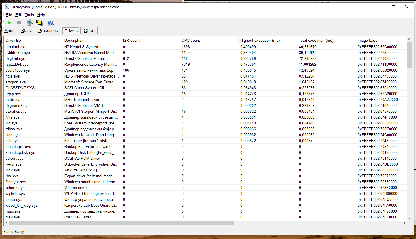 Highest reported total DPC routine time (%): 0,030509 Driver with highest DPC total execution time: rspLLL64.sys - Resplendence Latency Monitoring and Auxiliary Kernel Library, Resplendence Software Projects Sp.