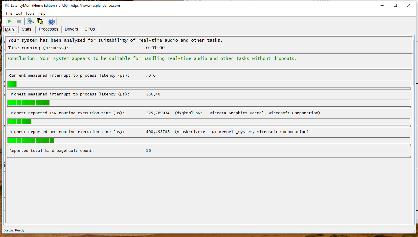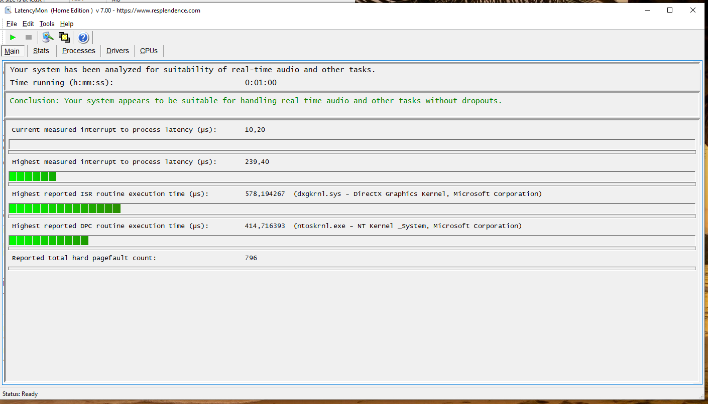 _________________________________________________________________________________________________________ CONCLUSION _________________________________________________________________________________________________________ Your system appears to be suitable for handling real-time audio and other tasks without dropouts. LatencyMon has been analyzing your system for 0:01:01 (h:mm:ss) on all processors.