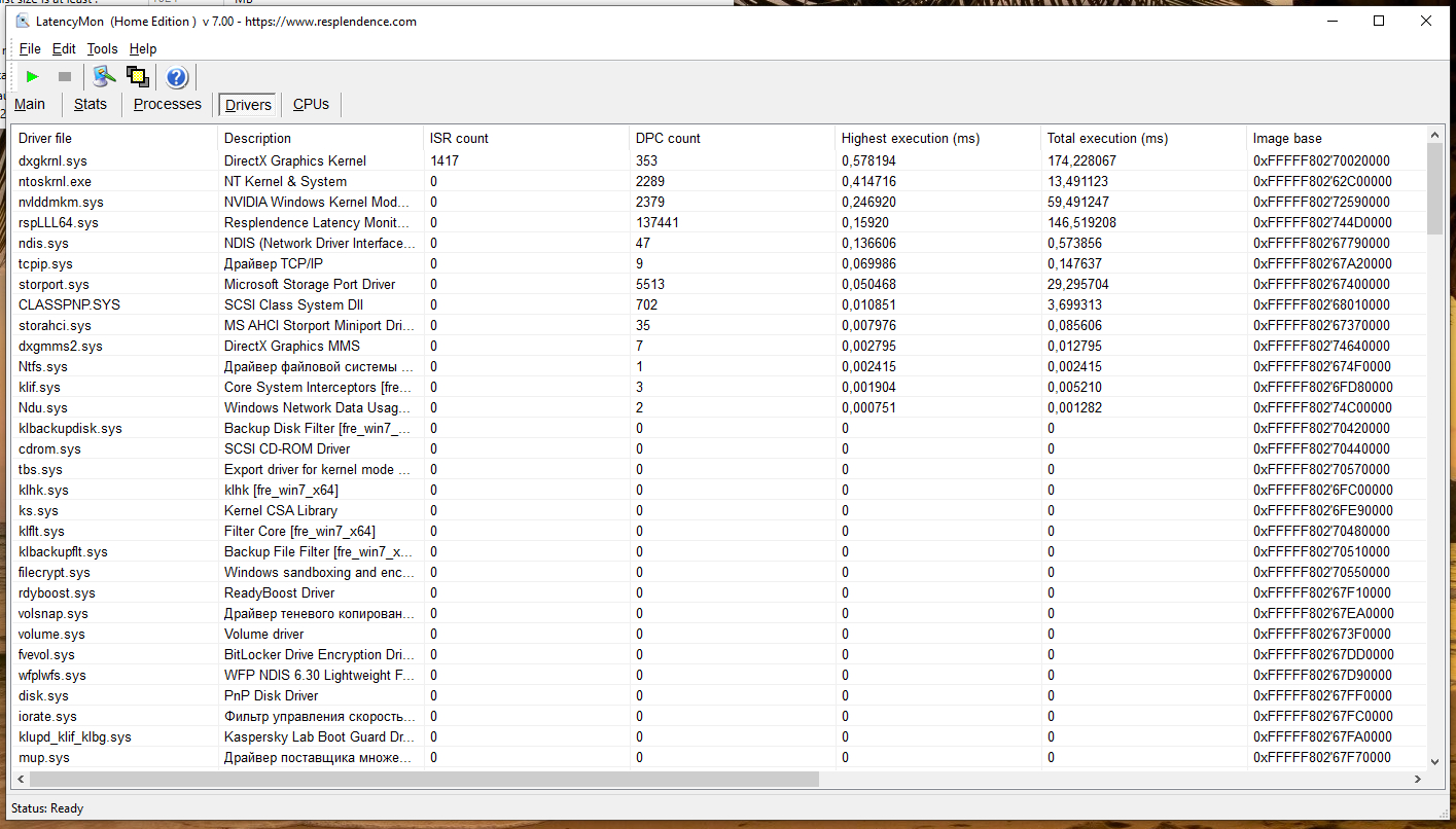 В LatencyMon проблемы идут от dxgkrnl.sys и nvlddmkm.sys. Но ntoskrnl.exe их периодически догоняет.