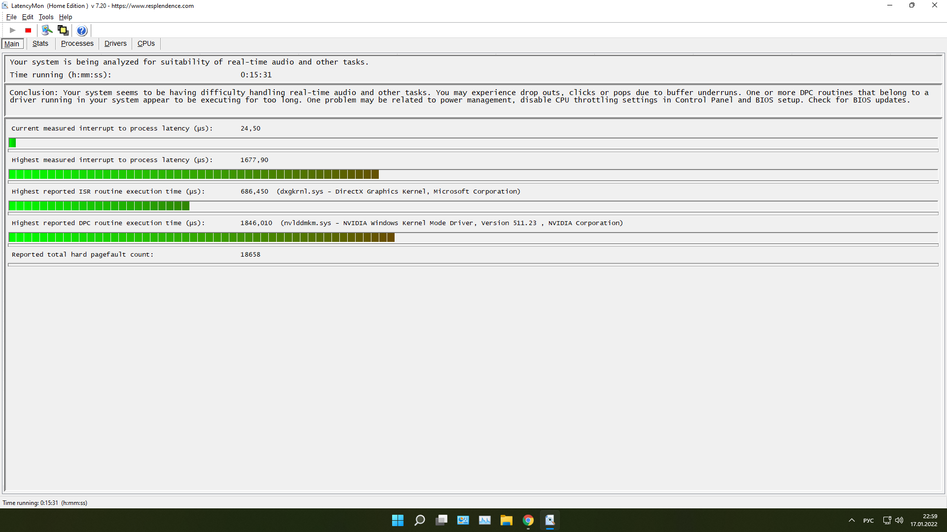 NOTE: some processes were hit by hard pagefaults. If these were programs producing audio, they are likely to interrupt the audio stream resulting in dropouts, clicks and pops. Check the Processes tab to see which programs were hit.