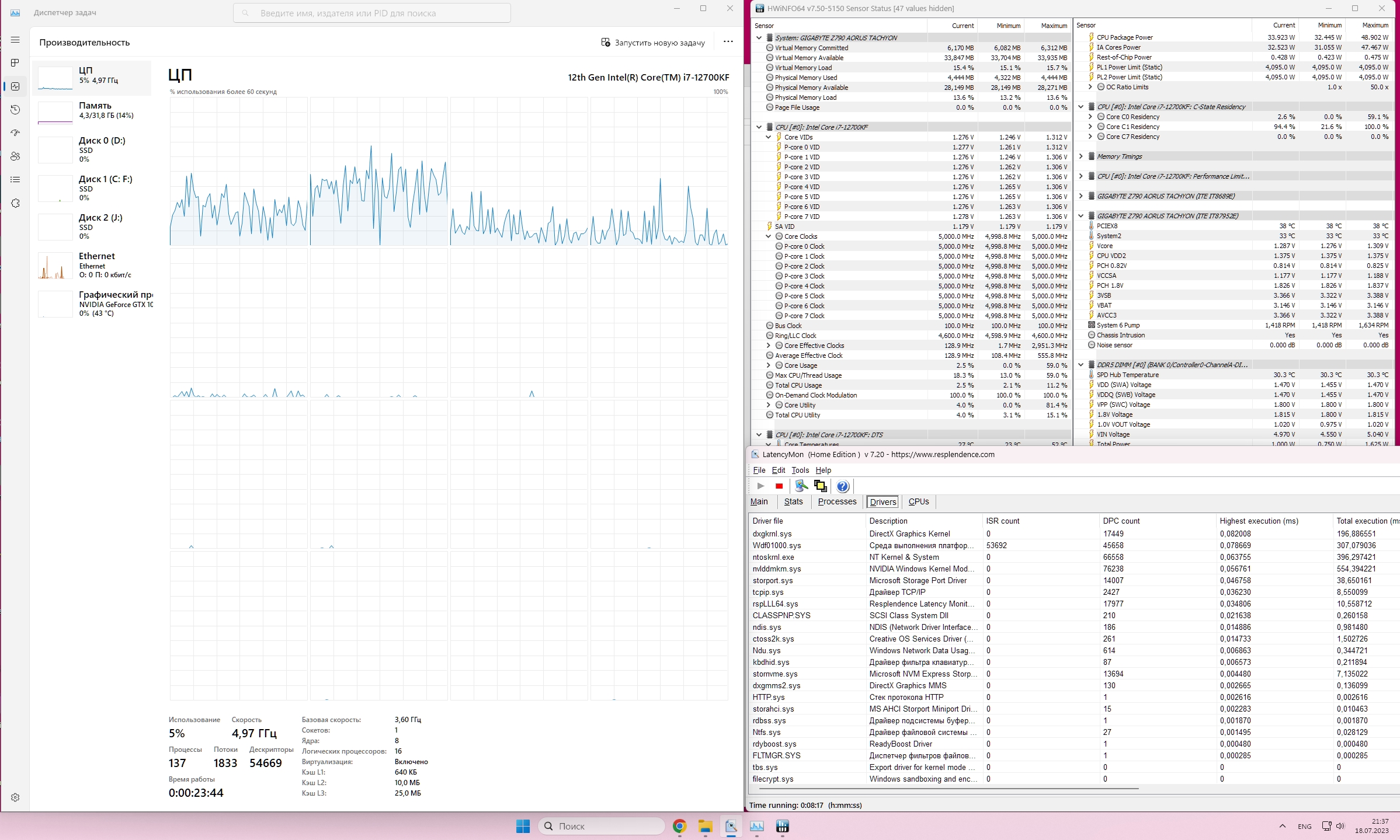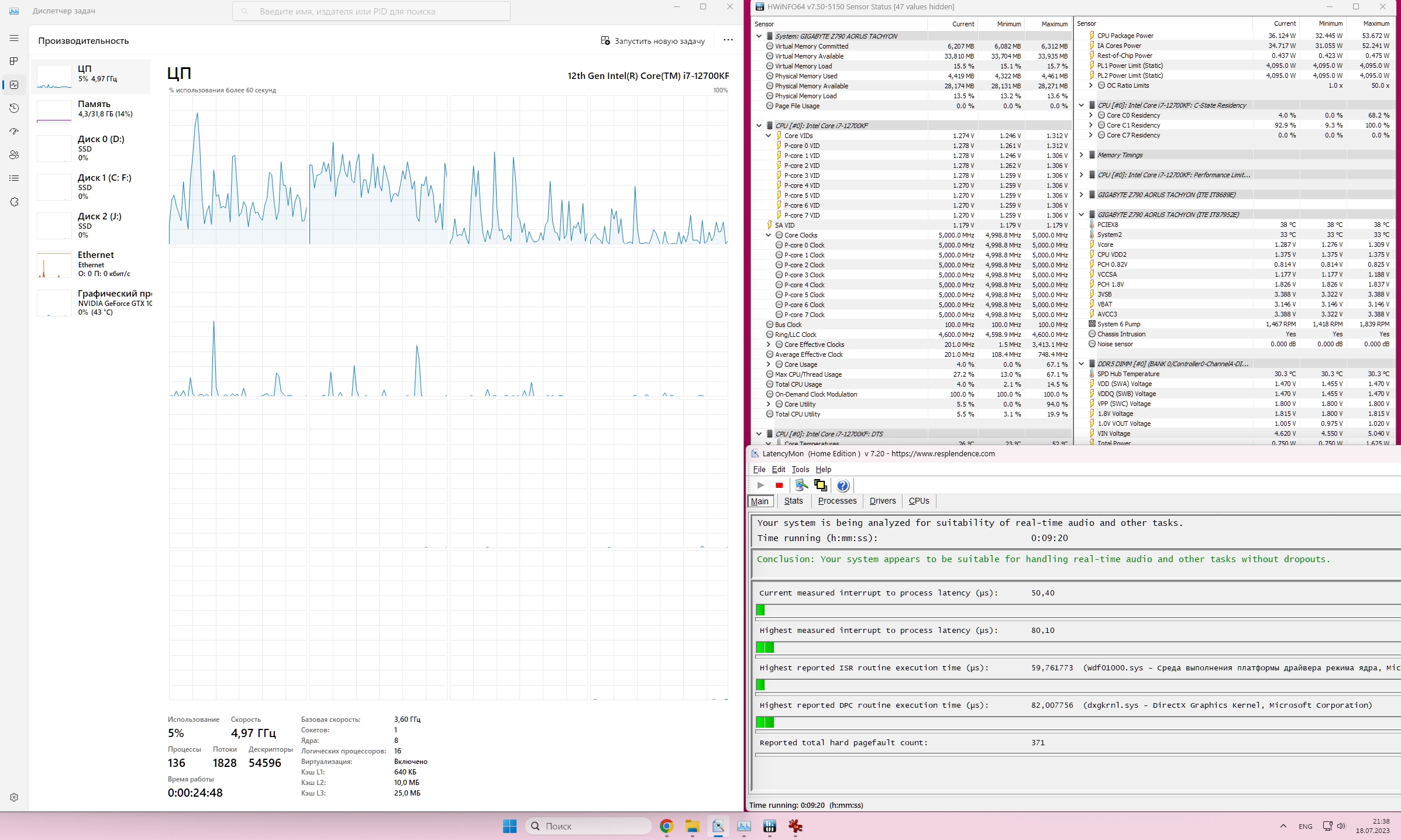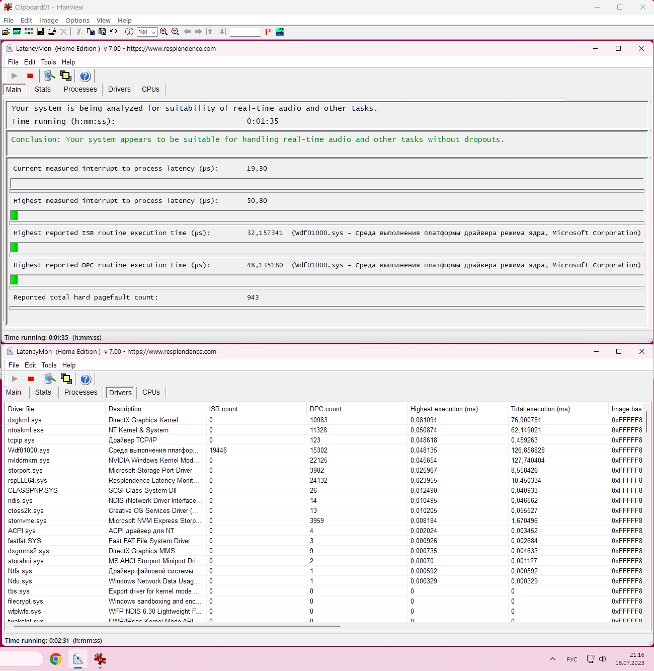Браузер с тонной вкладок, игра в фоне, войс, всякая мелочь, я.музыка через встройку и остальное в монитор через HDMI. Я ещё и переключался с этого окна в процессе. Даже если я запущу нагруженную виртуалку, то она вызовет рост DPC в 3-4 раза это всё ещё не повлияет на производительность, фризы и щелчки звука.