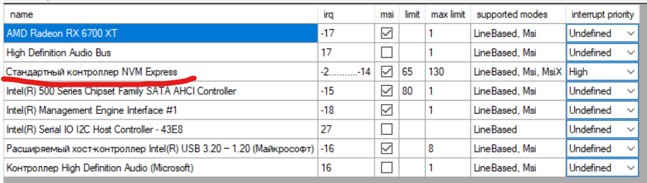 В утилите MSI_util_v3 кликаешь два раза на нужном устройстве, открывается редакто реестра в нужном месте, заходишь глубже в ветку Device Parameters\Interrupt Management\Affinity Policy, смотришь на параметр DevicePriority, меняешь через утилиту приоритет для проверки и смотришь изменилось ли значение в редакторе реестра(нужно обновить инфу через F5). Если значение изменилось то это та настройка что нужна. Меняешь значение этой настройки на то значение что указано в инф файле. Похоже что 1 это низкий приоритет, 2 средний и 3 высокий.