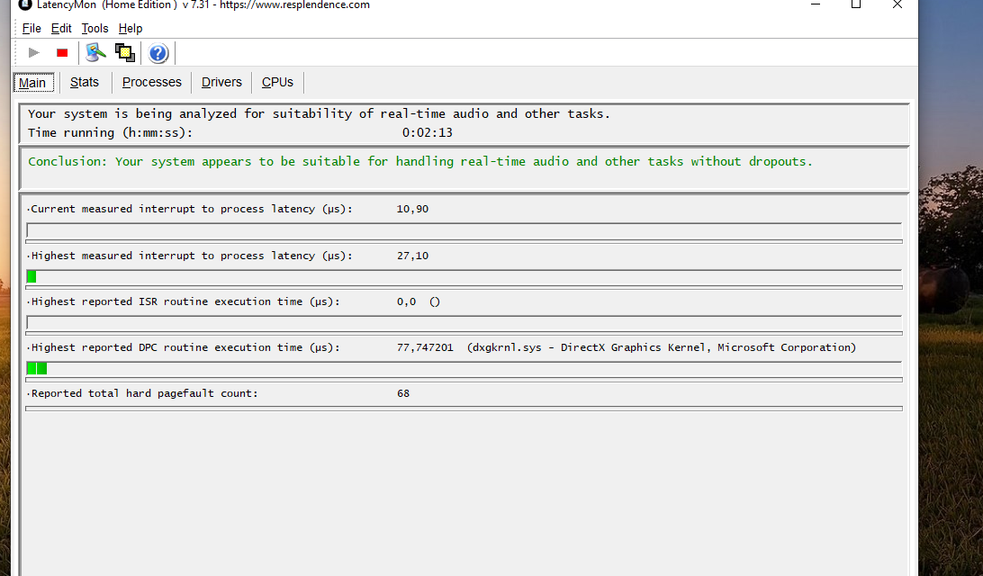 Осуществлять мониторинг программойLatency Monitorнужно в течение 1 минуты, в состоянии простоя системы т.е. без дисковой, сетевой активности, и любой другой, с выключенным ав и приложениями в трее и автозагрузке, не раньше чем через 2 минуты после загрузки системы. Не двигаем мышку и не используем клавиатуру в момент измерений. Потом остановка и скриншот.