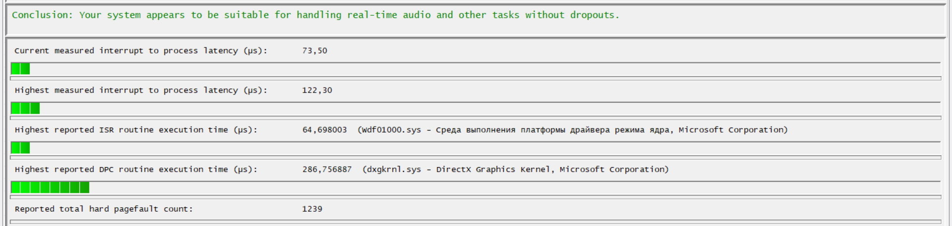 Ровно не усидел, сил не было терпеть. Стал чистить хвосты от удаленных программ, обновлять все драйвера. Один фик, тоже самое, несколько раз в минуту задержка подскакивала до 685-710. Потом обратил внимание на версию программы Latency Monitor, была 7.0.0 (на память), скачал последнюю. Проблема исчезла, задержка 40-100, выше не поднимается! Теперь я спокоен