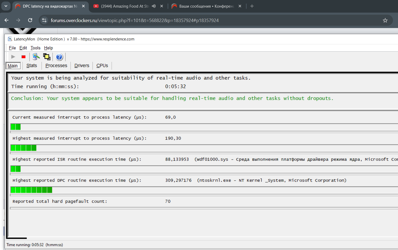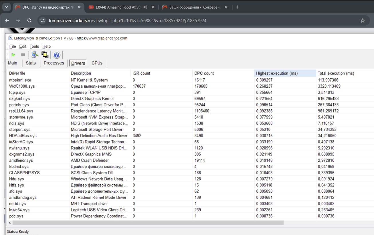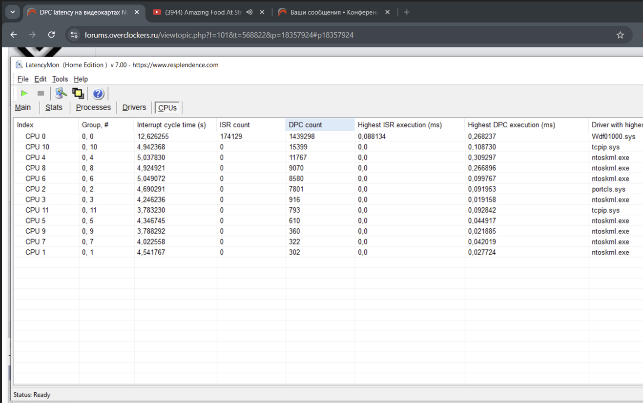 На видеокартах nvidia задержки DPC невероятным образом, происходят из-за подключения вашего монитора по hdmi кабелю. Задержка выше в том случае , если задейсвованы DP порты (тоесть когда к ним подключены мониторы и работают), и процессор работает с настройками по умолчанию касаемо перехода ядер в режим энерго сбережения, + когда включена парковка ядер. Чтобы комп заработал без задержек нужно выключить монитор который работает по HDMI и перезагрузить компьютер, + в bios должны быть отключены энерго сберегающие функции и парковка для процесссора (парковку ядер можно попытаться оталбчить в windows через processlasso (зависит от настроек bios), + мной через консоль cmd была применена команда bcdedit /set disabledynamictick yes. При задействованных трех DP и включенных трех мониторах задержки в самых тяжелых играх не превышают 500ms. В то время как с задейсвованным hdmi при включенном мониторе подключенном к нему подскакивали до 2000ms были лаги в играх и щелчки в звуковом тракте на всех аудио устройсвах (встройка, внешняя usb звуковая карта , звуковая карта через pcie-e).