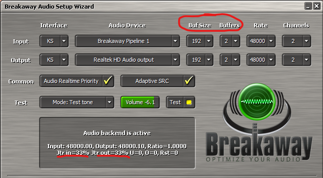 при дальнейшем понижении размера и кол-ва буферов, что бы это не значило, растет джиттер и треск уже непрерывный, который уже бьет по фпс в играх. Джиттер в пределах 15% без искажений. Конечно все это при условии что родной звук без проблем.