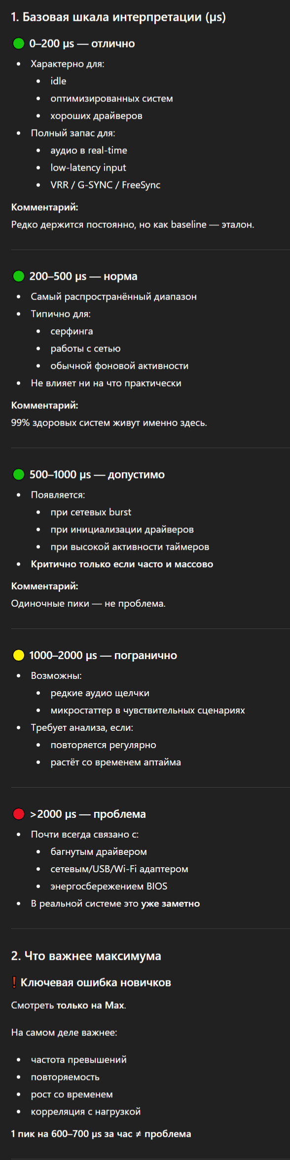 помню еще в старой latencymeter зеленой зоной считались прерывания до 1ms и желтой до 2ms, я по старинке беру это за норму для своих обычных рабочих сценариев - серфинг, игры и прочий повседнев. Без этой статы в работе разница незаметна, одиночные редкие алярмы не в счет ибо рабочий шум, об этом и шапке упоминается, что обращать внимание следует на частоту а не на макс значение прерываний. Диагностику советую проводить сначала этой прогой, час в серфинге, два под игровой/рабочей нагрузкой. Latencymon для глубокого анализа при явных проблемах. Замеры по паре минут в простое, сразу после ребута и без рабочей нагрузки считаю практически бесполезными, ака охота за попугаями в бенчмарках. Все это имхо.