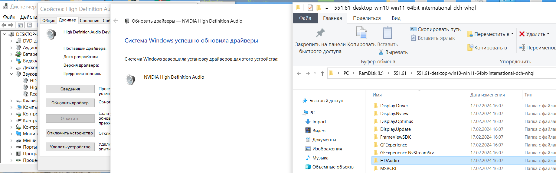 Добавлено спустя 55 минут 48 секунд: установил HD Audio из распакованного 551.61, через диспетчер устройств.