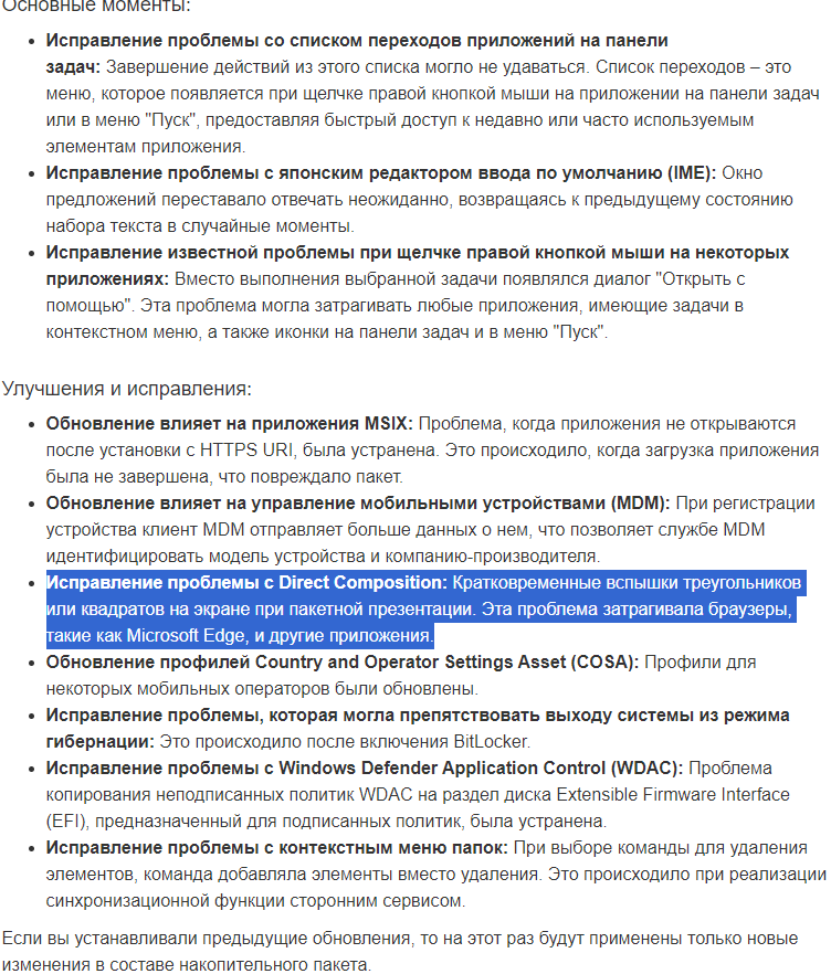 Исправлена проблема с презентациями Direct Composition. На экране появлялись кратковременные вспышки треугольников или коробок. Это затрагивало браузеры, такие как Microsoft Edge, и другие приложения.