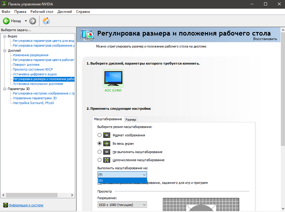 Подскажите почему в настройках регулировки размера и положения раб. стола -> масштабирование -> выполнить масштабирование отсутствует масштабирование на дисплей? И как его вернуть?