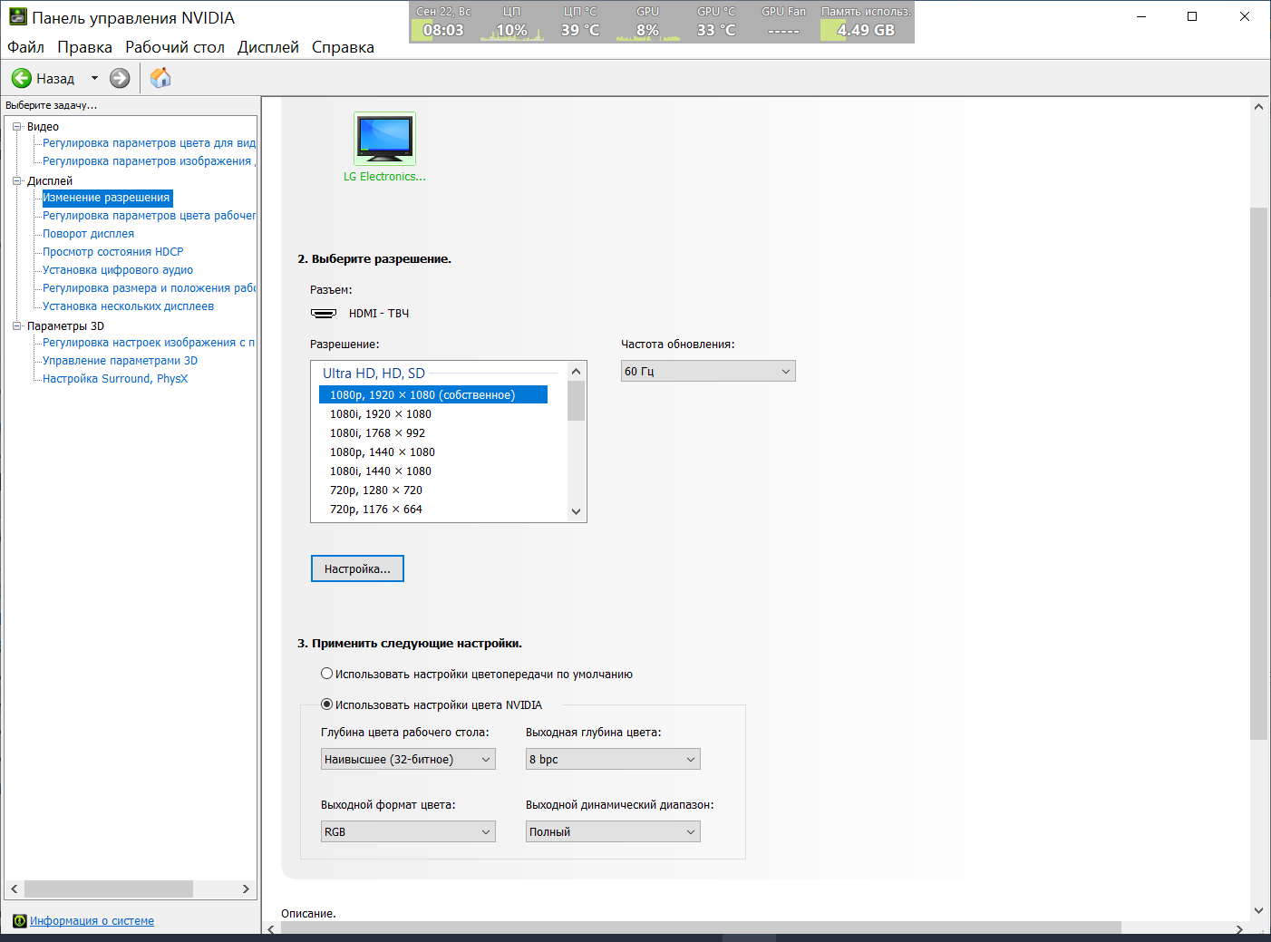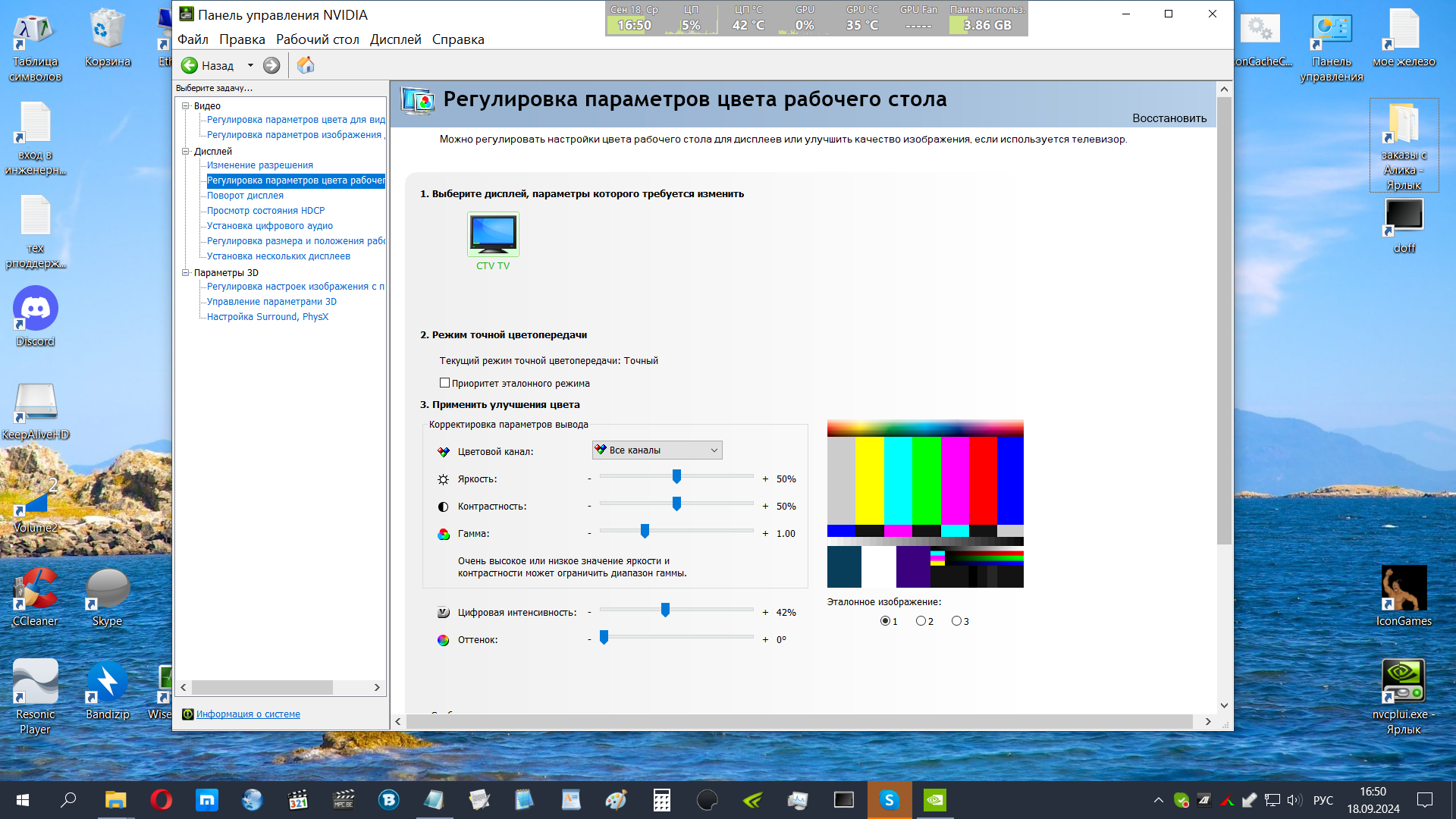 в настройках разрешения так же. с тв не найду скрин. для тв уменьшаю цифровую интенсивность, по умолчанию сильно цветасто(в тв режим point to point/"точка в точку", настройки цветности в меню не активны, только яркость и контраст)