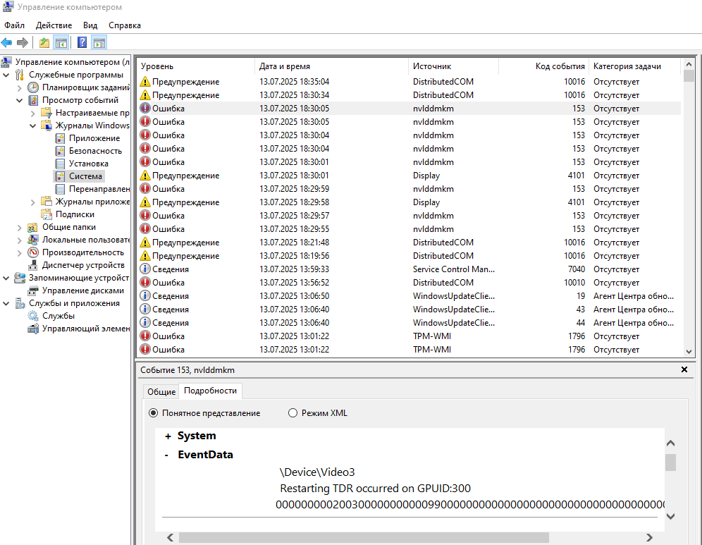 Стоят крайние дрова с 1 июля, сегодня поймал глюк на ровном месте, сидел в браузере хром, в фоне висят танки....экран повис, потом моргнул, черный экран и снова включился...в диспетчере множество ошибок 153