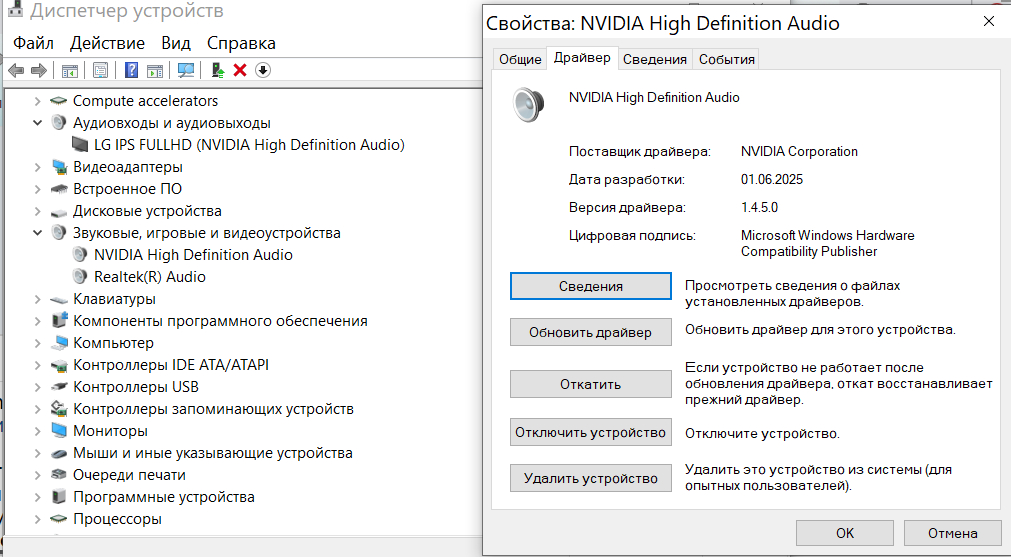 Монитор подключен через DP, внешняя акустика к выходу звука монитора. Никакие твикеры не использую. НО! Иногда (пока точно не понял причину) пропадает звук - в браузере, в плеере Daum PotPlayer и пр. Восстанавливаю тапом на Проверка - см. картинку. На другом ресурсе высказались, что связано с глюком nVidia HDAudio. Так ли?