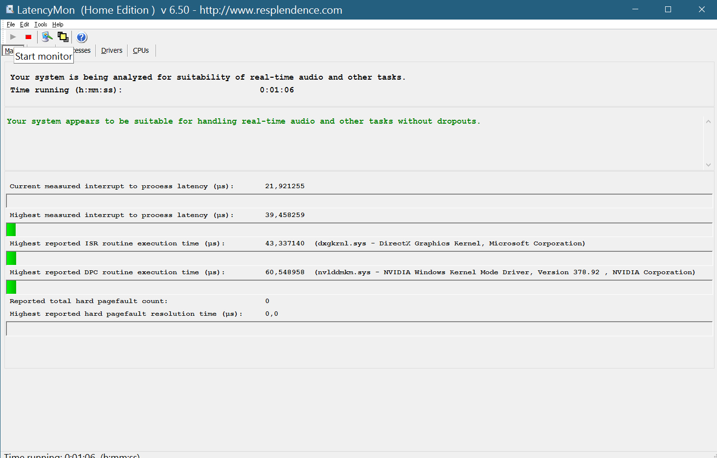 Осуществлять мониторинг программойLatency Monitorнужно в течение 1 минуты, в состоянии простоя системы т.е. без дисковой, сетевой активности, и любой другой, с выключенным ав и приложениями в трее и автозагрузке, не раньше чем через 2 минуты после загрузки системы. Не двигаем мышку и не используем клавиатуру в момент измерений. Потом остановка и скриншот.