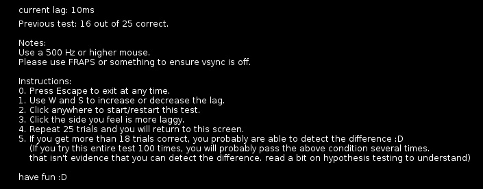 kpaxo6op как я понял надо, кнопками w и s выставить некое время лага, например 20мс, потом водить курсором слева и справа и определять где курсор более тормозно реагирует, после этого кликнуть по половине где тормоза. И так 25 раз. Если ты правильно ощущал задержку и кликал по тру половине, то количество правильных нажатий будет близко к 25. Постепенно уменьшаешь время лага до того момента когда начнешь ошибаться. т.е. скажем 20 из 25 указывает что ты реально чувствуешь задержку, а скажем 17 из 25 это уже угадываешь