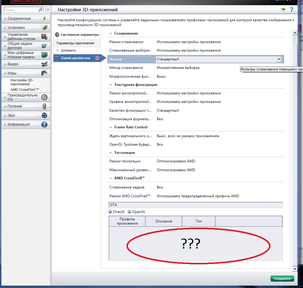 openclocker Видишь кнопочку "Добавить"? Вот, нажимай её. Так ты добавишь отдельные настройки под конкретную игру. И в этом режиме внизу появится новое поле с выбором профилей. Можешь выбрать готовый профиль от AMD, а можешь сам пошаманить. Я туда лезу только тогда, когда готовых профилей нет. И в последнее время это не редкость, т.к. уже 7-й месяц пошел без новых драйверов. А бета версии я зарекся ставить, намучался уже с ними в своё время:)
