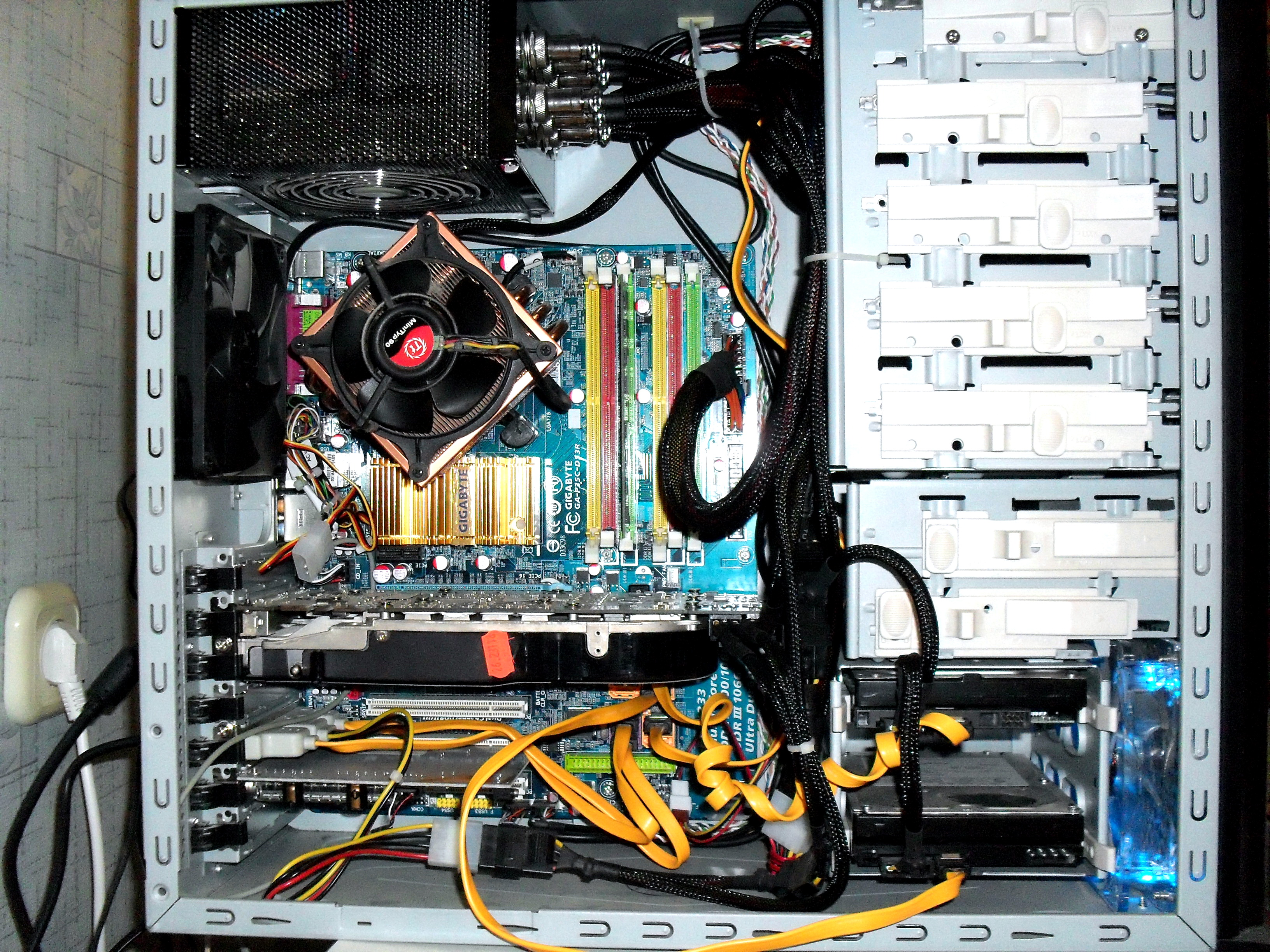 Здравствуйте. У меня такой кулер на проце Intel E6750-см фото. Проблема с том, что при выключенном (реобасом) 92 мм вентиле на кулере и 2-х корпусных вентиляторах проц. нагревается до 80 гр Цельсия в простое (открыт хром и юторрент на скачке). Хотя вр0де и ребер много и медный-по идее должен пассивно нормально охлаждаться. При этом если все три вентилятора в корпусе включить на максимум, то в простое температура процессора +35 С по Цельсию. Корпус - CoolerMaster Centurion 532 (см фото), на вдув и выдув установлены по 120 мм вертушке. Может дело в том, что термопасту с 2010г не менял (она, что была с кулером в поставке) и основание не шлифовал? Также подумываю о замене его на Thermaltake Flexi (CLP0589), т.к у него скорость регулируется ШИМ и по отзывам оч тихий при доступной цене. А этот меньше 1400 об/мин убавить невозможно (при этом шум еще заметен), дальше сразу отключается (и повышается tпроц см выше), невозможно 92 мм вентилятор кулера смазать (походу надо отверстие проделать). Что скажите о моем выборе Thermaltake Flexi-хорош? А также причина высокой темпы 80гр? . Заранее спасибо.