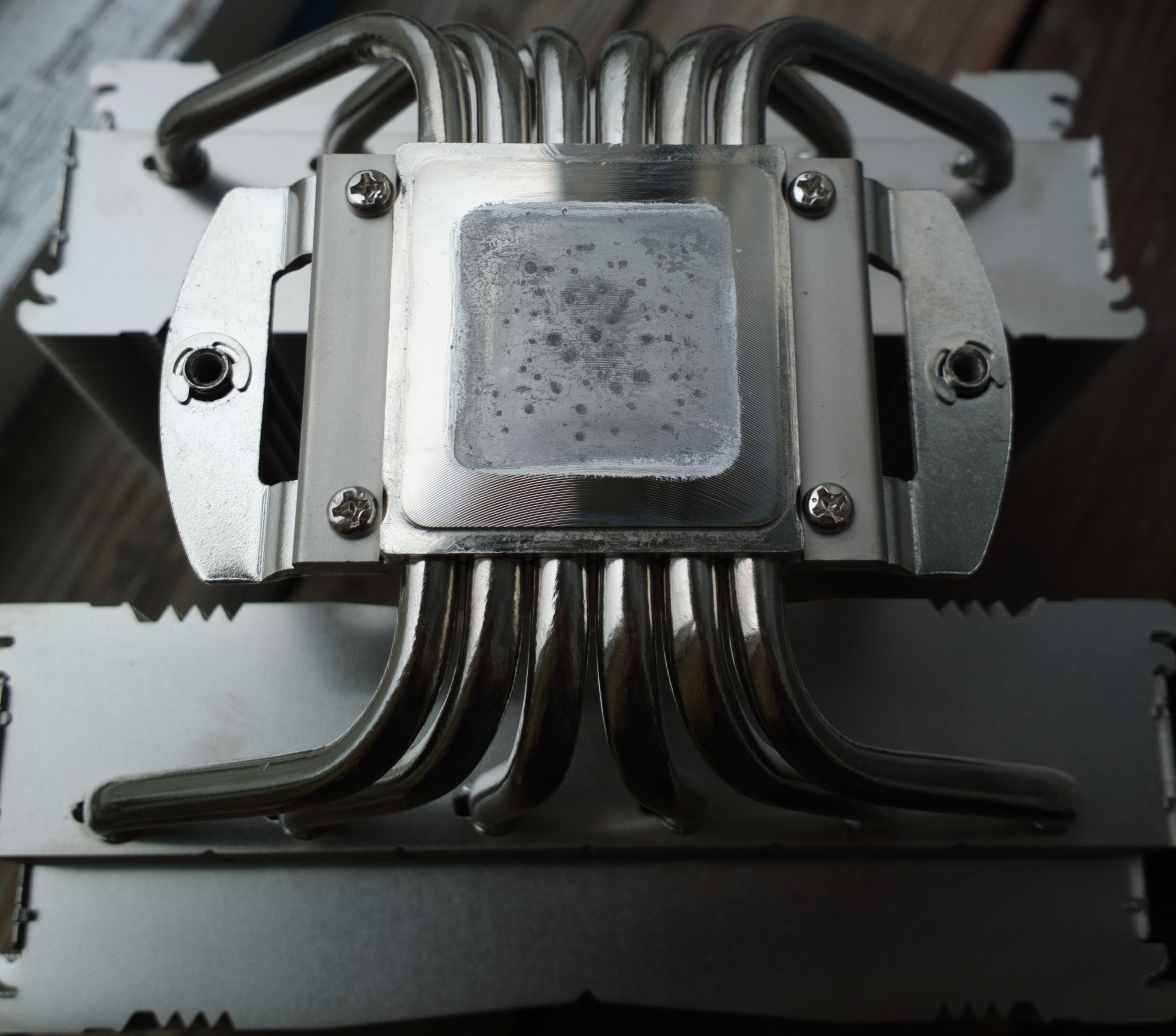 Хоть NH-D15 до сих пор прекрасно охлаждает, но маленькая странность всё же произошла. Итак, кулер был куплен в начале 2017, потом несколько месяцев использовался с жидким металлом, после чего был снят, основание почищено и ЖМ больше не использовался, только паста.