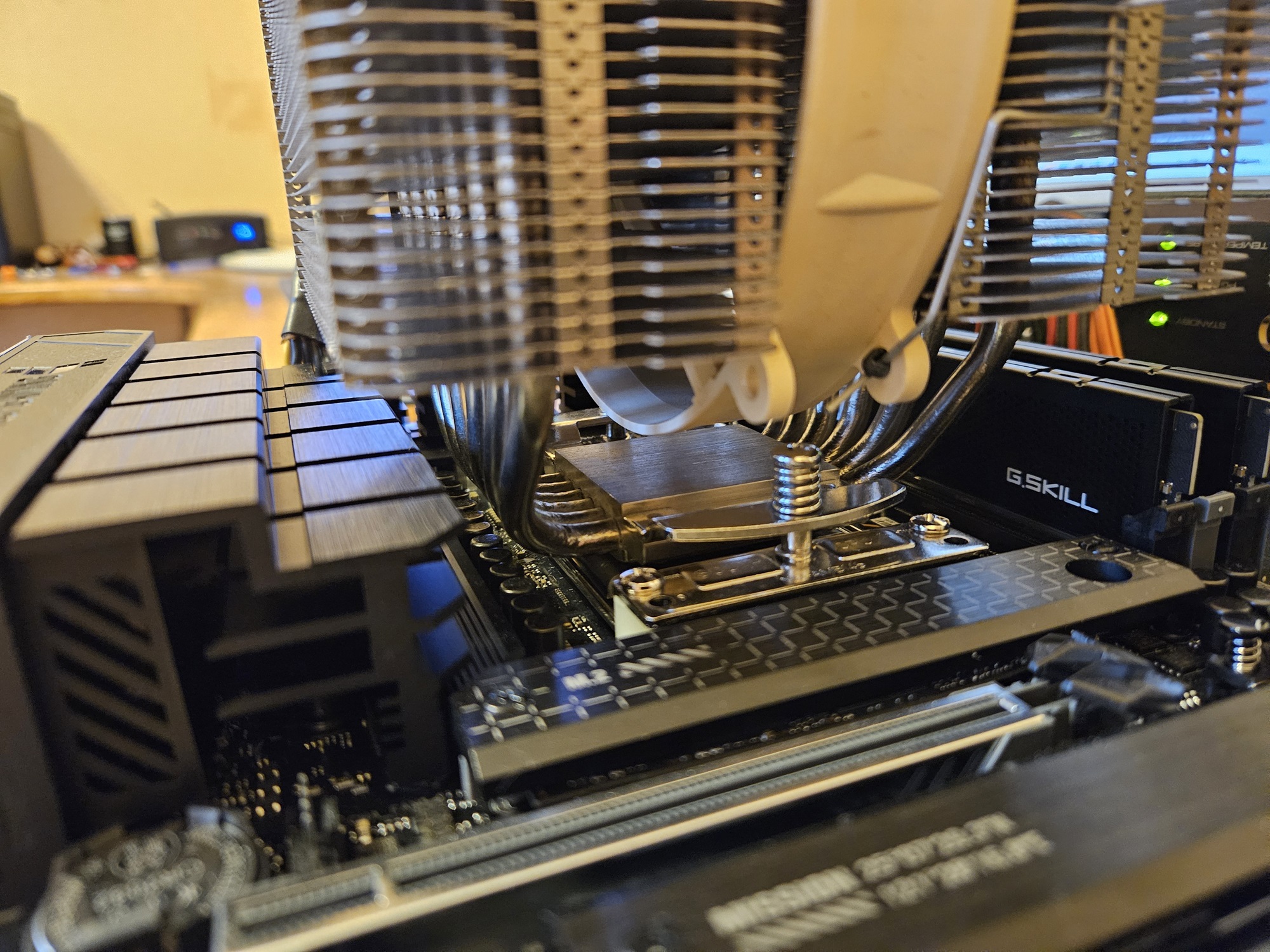 Oleg-29 Память Crucial Ballistix BL32G32C16U4W.M16FB1 во всех четырех слотах. Phanteks PH-F120T30 снизу почти лежит на памяти, сверху почти заподлицо с верхней пластиной радиатора (ниже хвостиков тепловых трубок). В средине штатный NF-A15 HS-PWM (140x150x25 mm)