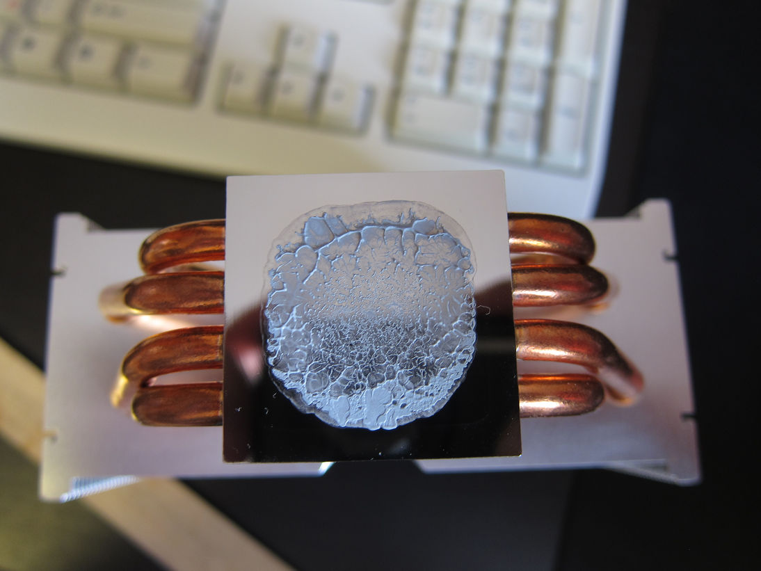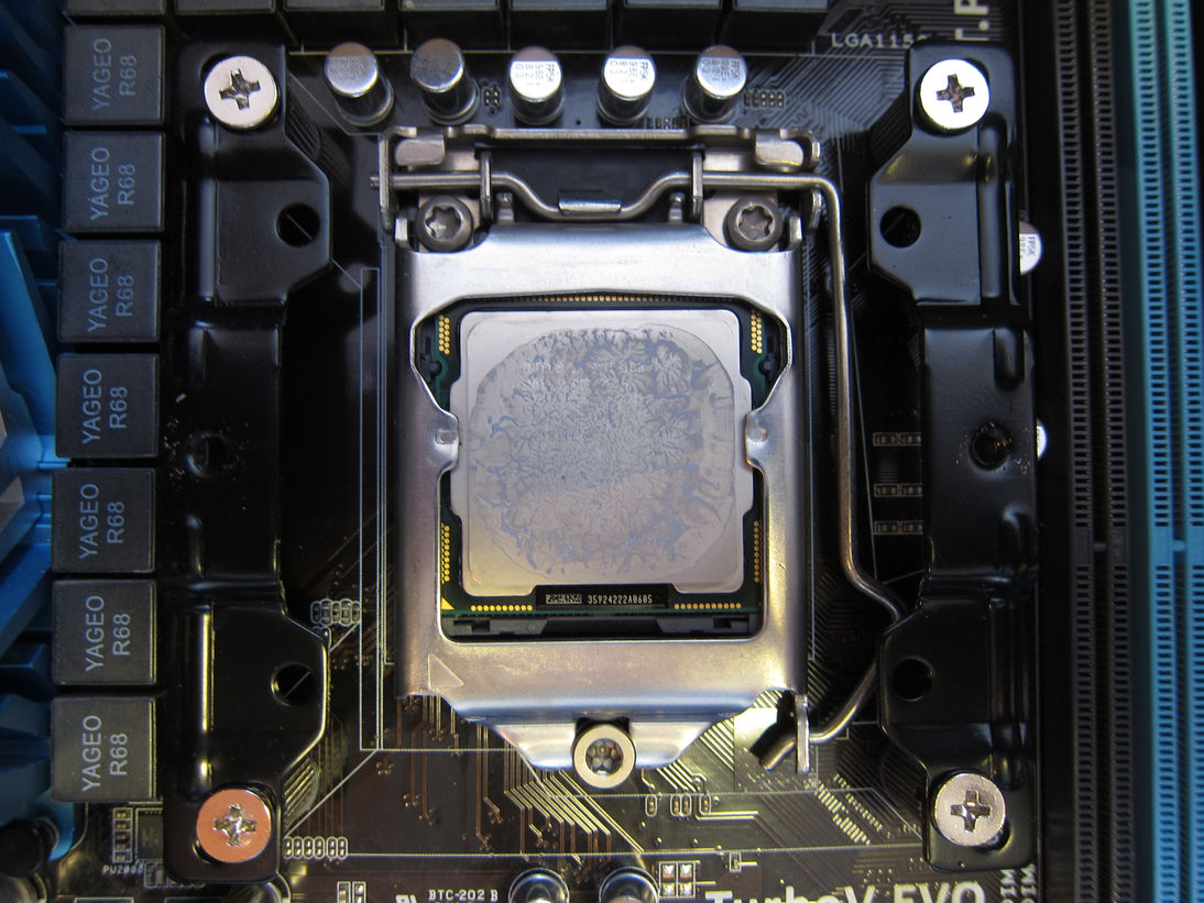 Nill_Space много наносите пасты, на подошве радиатора много излишков, по идее должно хватить той пасты, что осталась на крышке цп, а пасту с подошвы можно удалить. Выдавливайте на центр цп точку размером примерно с колотую горошину или с половину обычной булавочной головки и не размазывая просто ставьте ровно радиатор, под нагревом и давлением паста сама расползется в стороны тончайшим прозрачным слоем. Количество термопасты должно быть такое чтобы площадь расползания была не меньше площади кристалла цп, но и чтобы не доползала немного до краёв крышки цп. Подошву радиатора и крышку цп лучше как следует протереть очистителем, я например протирал ацетоном до тех пор пока ватка не переставала пачкаться.