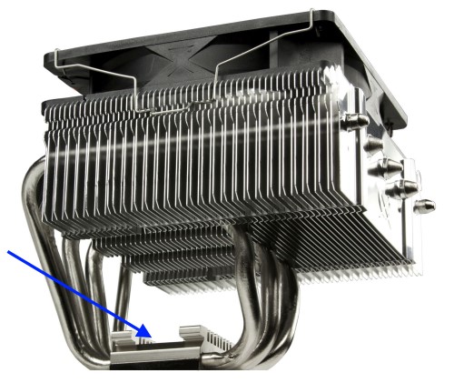 Где стрелка синяя на основание кулера (не с теплоотводящей стороны, не с рабочей) положить подложку, а сверху придавить пластиной прижимной. Смотря какой люфт пластинку какую-нибудь мож 0,2 или 0,5 мм- подобрать эксперементальным путем.
