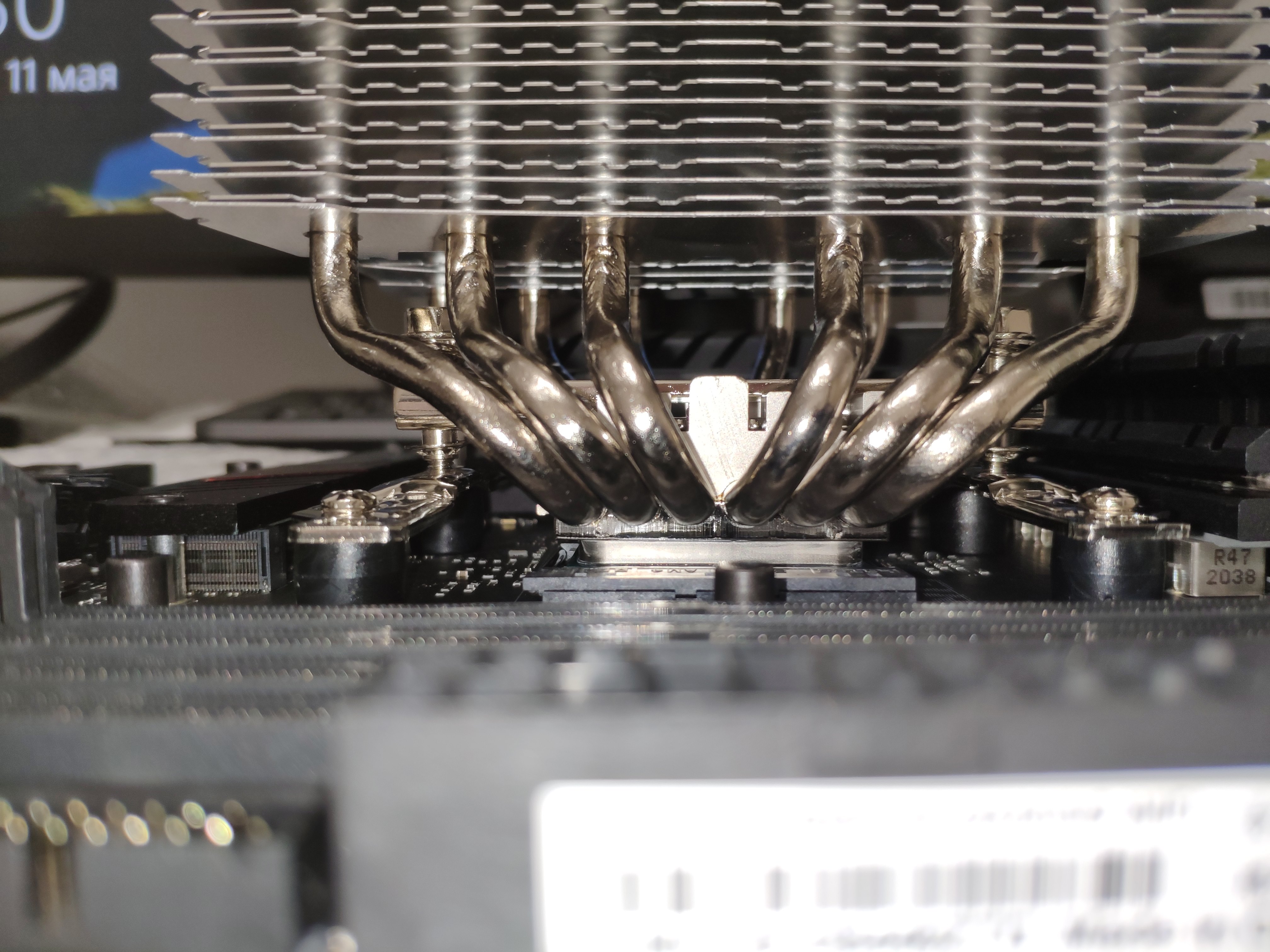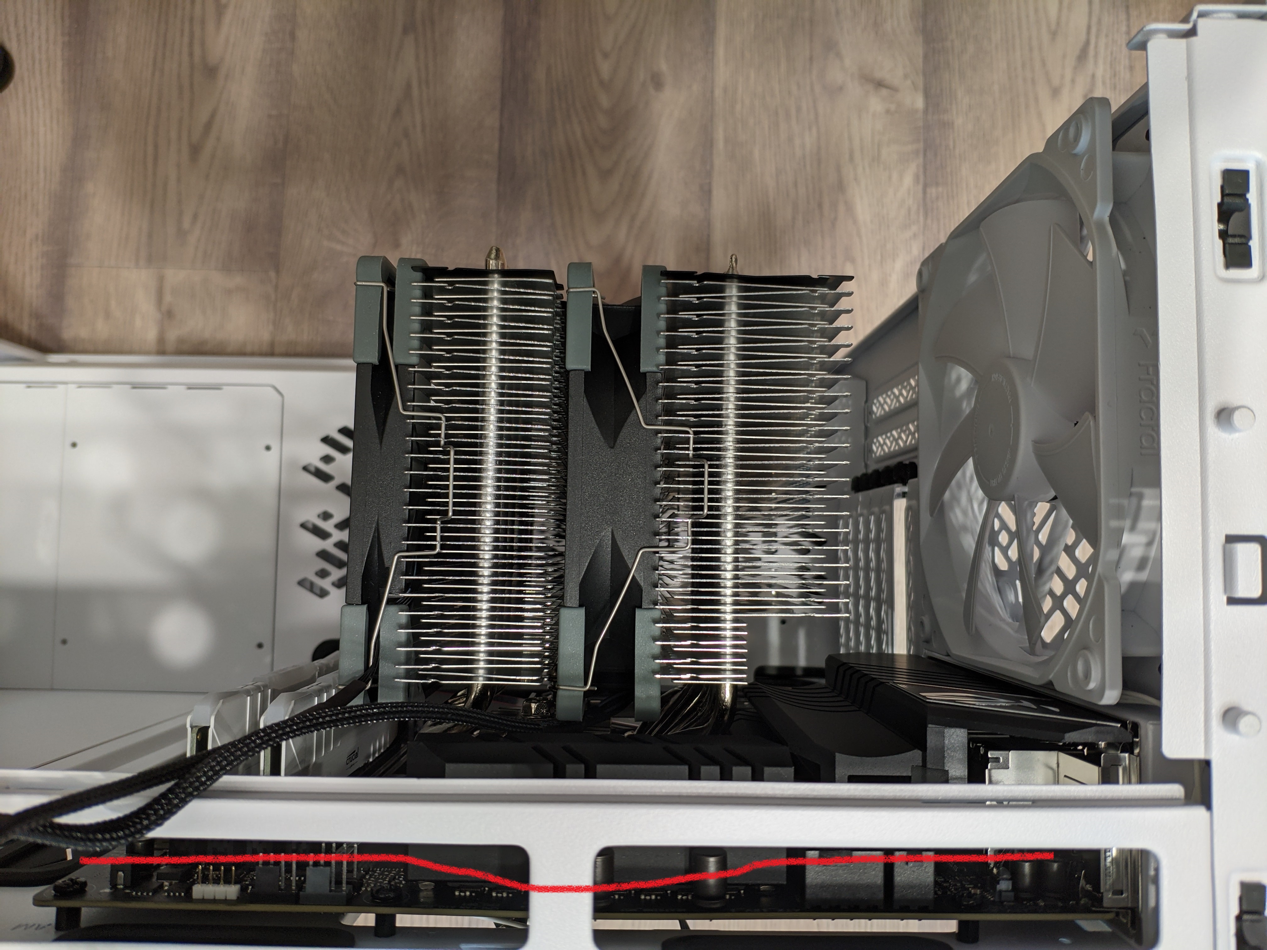 2. Кулер встал с небольшим наклоном в сторону портов матери (фото, где корпус сверху без крышки). Это нормально ли? Должен ли он стоять идеально перпендикулярно стенке корпуса? Выглядит не очень эстетично в корпусе с прозрачной панелью. Впрочем, только если всматриваться. Корпус – Fractal Define 7. Вообще и сама мать немного искривленная вся со стороны сокета (будто продалена в этом месте). Не похоже, чтобы кулер её так погнул (да и затягивал я, опять же, не до упора). Но все же ощущение, что проблема именно в кулере. Будто сами его радиаторы расположены с небольшим креном в сторону.