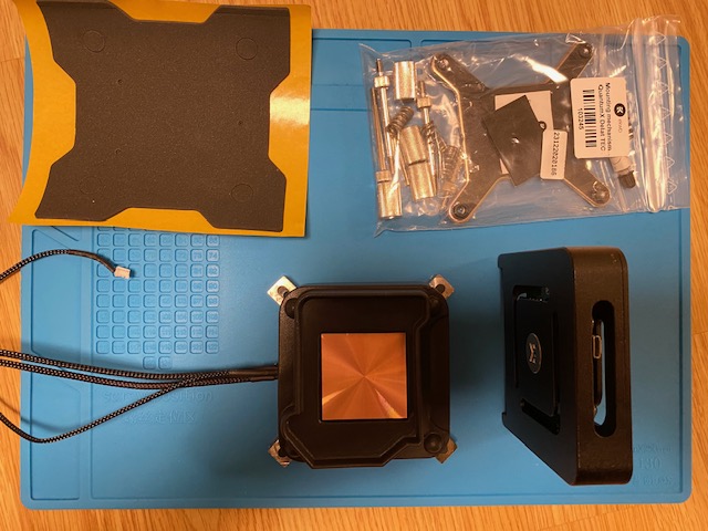 К плате управляющего блока подключается сам пельтье, датчик температуры, вклеенный в подошву и обычный PCI-E 8-ми пиновый разъём, как на график карту. Штекер разъёма на проводах самого пельтье, подключаемый к управляющему блоку, если кто будет искать такой же, - Mega-Fit. Я очень долго курил сайт молекса, прежде чем определить штекер, так что надеюсь, что кому-то сильно сэкономил время. Как я уже писал, на сайте производителя пельтье такого нет. Почти все, если не все, на 12 вольтах выдают максимально 125 ватт. А в видеообзоре дербауера мы видим почти 170 ватт. Интел обещает до двухсот. Это значит, что, либо Laird сделал специальную серию модулей пельтье для интела, умеющую на 12-ти вольтах выдать до 200 ватт, либо, как сказал CrownA, обнаружив на плате мосфеты, на плате стоит преобразователь напряжения. Скорее всего второе, но проверить это мне пока не удалось. AIO Corsair H115i Pro, который я навесил на модуль, не справляется с отводом тепла с горячей стороны пельтье и винда, после запуска программы Intel Cryo Cooling, завершает работу через 3 секунды после старта программы (Intel Cryo Cooling). Попытка просто подключиться вольтметром к управляющему блоку без самого модуля успехов не принесла: ошибка инициализации и не даёт запуститься проге. Свободного контура у меня пока, к сожалению нет: помпы аква мне пришлёт, как я понял, вместе с заказанным водоблоком, т.е. нескоро ;)