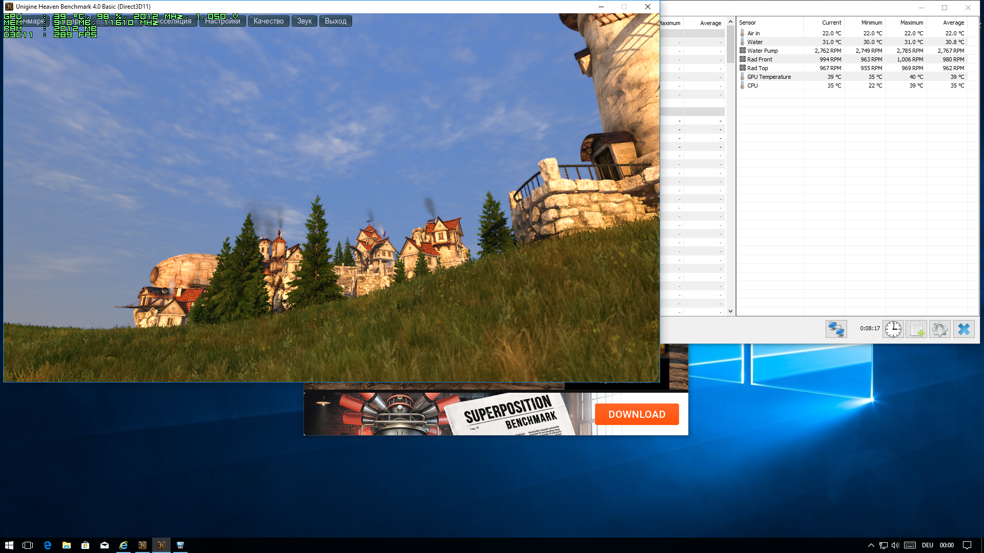 atlonn На полностью прогретой системе 8 минут Heaven, на девятой минуте вылетает HWiNFO64,не знаю пока почему. Два слим радиатора 360 и 240,вертушки be quiet silent wings 2