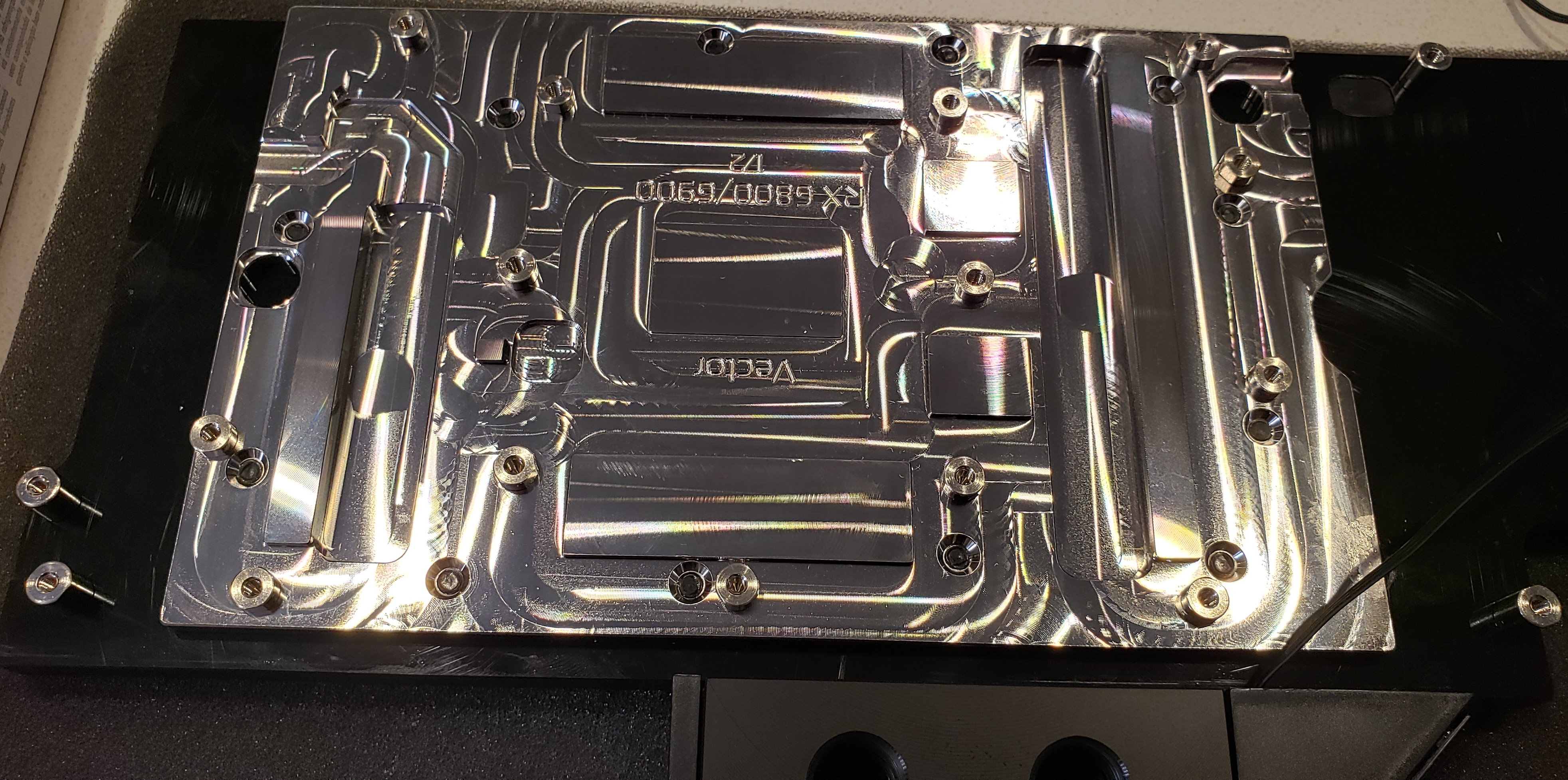 Изменения по СВО части: 1) Alphacool NexXxoS XT45 Full Copper X-Flow 360mm (x2) (AC-14235) ---> Alphacool NexXxoS XT45 Full Copper X-Flow 360mm (AC-14235) + Alphacool NexXxoS XT45 Full Copper 360mm V.2 (AC-14283) Замена одного X-Flow на классический радиатор дала возможность убрать 3шт 90 градусных изгибов, контур стал проще. 2) Обновлен блок на видеокарте, естественно: GPU water block: EK-Quantum Vector RX 6800/6900 D-RGB - Nickel + Acetal (EK-Q-VECT-RX6800-6900-DRGB-NA) GPU backplate: EK-Quantum Vector RX 6800/6900 Backplate - Black (EK-Q-VECT-RX6800-6900-BP-BK) Я капец недолюбливаю EK, но касательно инструкции/комплекта (полноты) /инструментов, EK оказалась лучше Bitspower. Также порадовал backplate (на 1080TI у меня использовался родной, и он был декоративный, поэтому моя оценка естественно субъективная), но он достаточно толстый, требует нескольких термо прокладок, так что меня он порадовал. Вроде как даже помогает в охлаждении, учитывая то, что память и ядро с другой стороны платы. Что касается самого водоблока, то в принципе ничего необычного или плохого. Больше всего нравится то, что в контуре теперь нет оргстекла. 3) К уже имеющемуся CPU водоблоку докуплен комплект крепления для AMD 3000/5000, со смещением: Retrofit kit socket AM4/3000/5000 for cuplex kryos NEXT (AQ-21788) 4) По мелочи изменены фитинги, например добавлены несколько штук Bitspower Carbon Black Enhance 90-Degree Dual Multi-Link Adapter For OD 16MM (BP-CBE90DML16), очень удобно для мест, где нужны изгибы малого радиуса. 5) Залит новенький Koolance 702 теплоноситель. Изаначально думал залить старый, но фильтрующая бумага стоит 12$, а 2 бутылки Koolance 702 обходится в 25-30$, так что мне проще было купить новый.