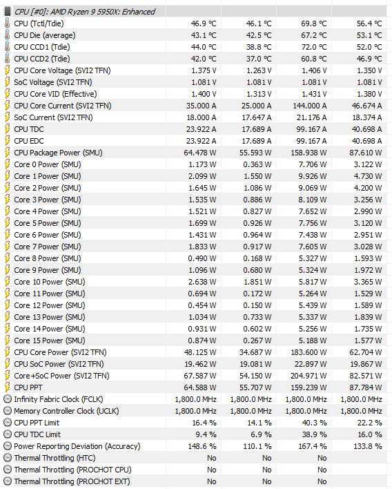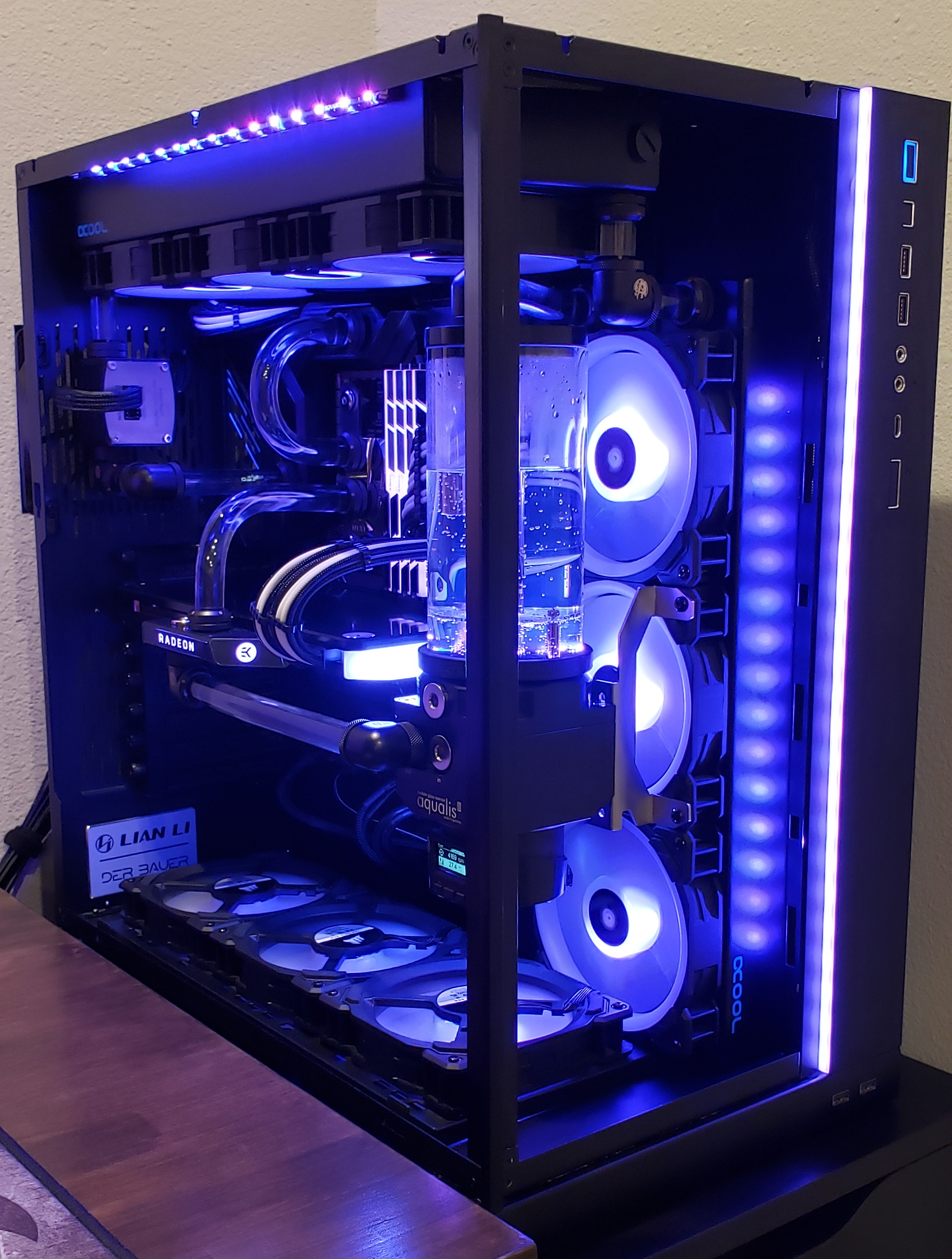 Pump: Aquacomputer D5 Next RGB Top: Aquacomputer pump adapter for D5 pumps Top mounting: Aquacomputer D5 Fan Mount 120mm Controller and Sensors: Aquacomputer Aquaero 6 LT + Passive Heatsink, Aquacomputer Flow Rate Sensor "High Flow USB", Aquacomputer Temperature Sensors Reservoir: Aquacomputer Aqualis base 450 ml CPU water block: Aquacomputer cuplex kryos NEXT VARIO nickel/nickel GPU water block: EK-Quantum Vector RX 6800/6900 D-RGB - Nickel + Acetal GPU backplate: EK-Quantum Vector RX 6800/6900 Backplate - Black Radiator: Alphacool NexXxoS XT45 Full Copper X-Flow 360mm + Alphacool NexXxoS XT45 Full Copper 360mm V.2 Radiator Fans: Corsair LL120 RGB 120mm (x9) + Deepcool FH-04 (x3) + Noctua NF-F12 PWM chromax.Black.swap Fittings: Bitspower G1/4" Carbon Black For 16mm OD Tube: Bitspower None Chamfer PETG 16mm OD Coolant: Koolance 702 Liquid Coolant