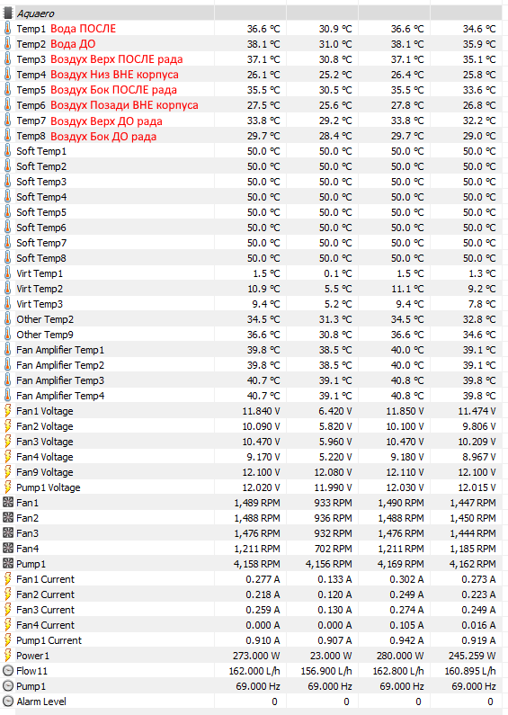 Скорость вентиляторов на радах = 1500 об/мин Скорость вентилятора позади на вдув (Noctua) = 1200 об/мин Скорость помпы (75%) = 4150 об/мин Калькулируемая отводимая радиаторами мощность = 270-280 Ватт (не уверен, что это норма в 100+ Ватт между потреблением железа и отведением радиаторами)