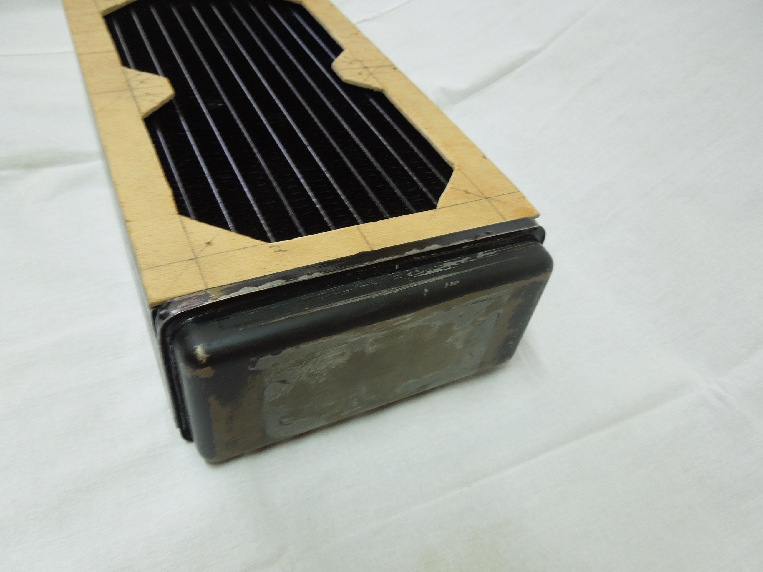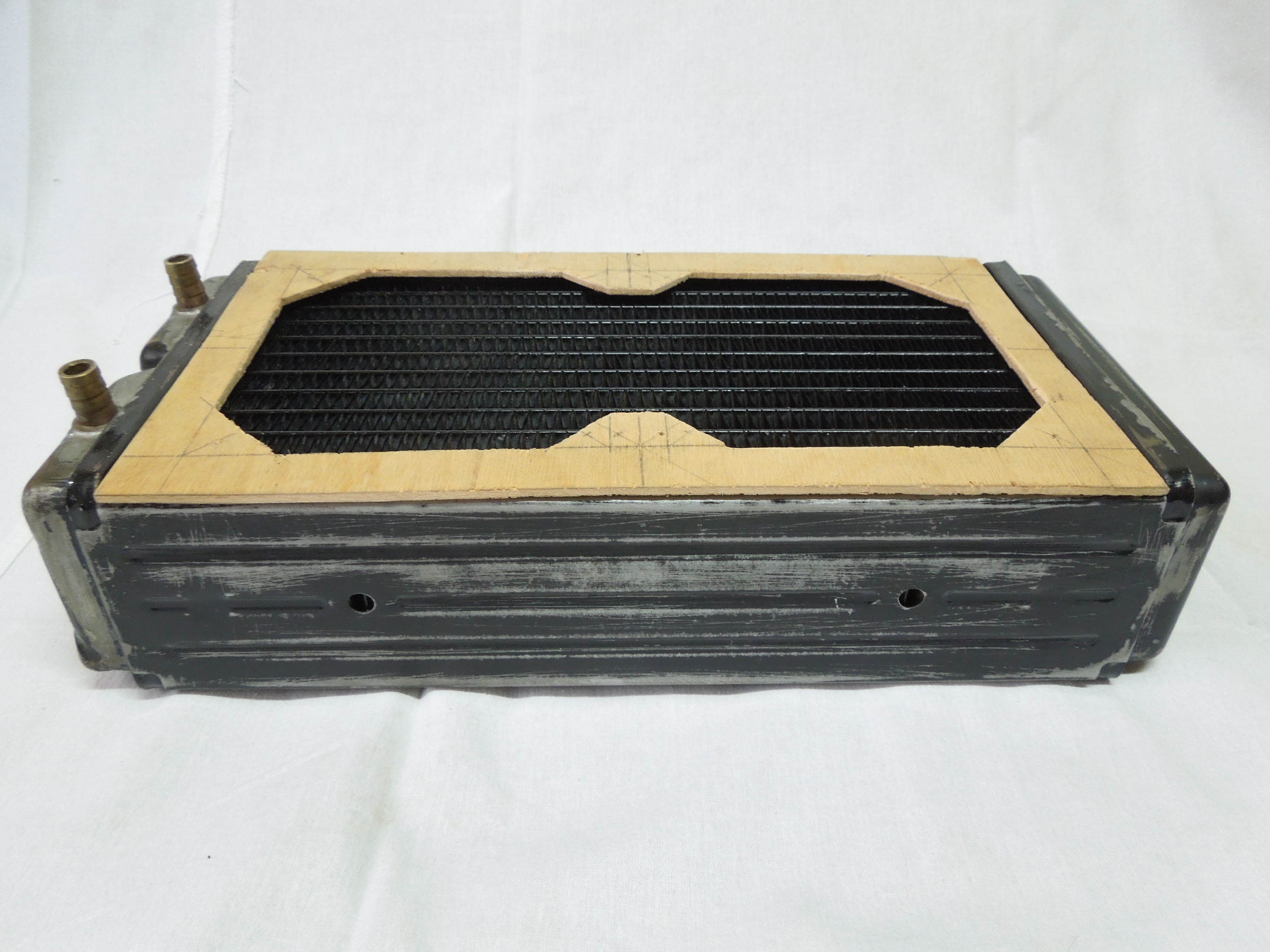 Всем привет! Я всеже с автомобильных радиаторов перешел на обычные, поставил 1х120х40 и 3х120х40 и вроде нормально, в планах добавить такой же 2х120х40. Но от идеи не отказался, начал делать оптимизацию радиаора от КАМАЗ под 2х140мм вентилятора, отпилил родные штуцеры, отверстия заделал бинтом с эпоксидкой. Припаял "елочки", хотя думаю всеже ндо было впаивать резборое крепление для фитингов нопеределывать уже не хочу. Основу крепления для вентиляторов выпилил из 3мм дубовой фанеры, потом вклею в нее а смоле гаечки и будет нормальный крепеж. Ну и покраска в финале, краску уже купил.