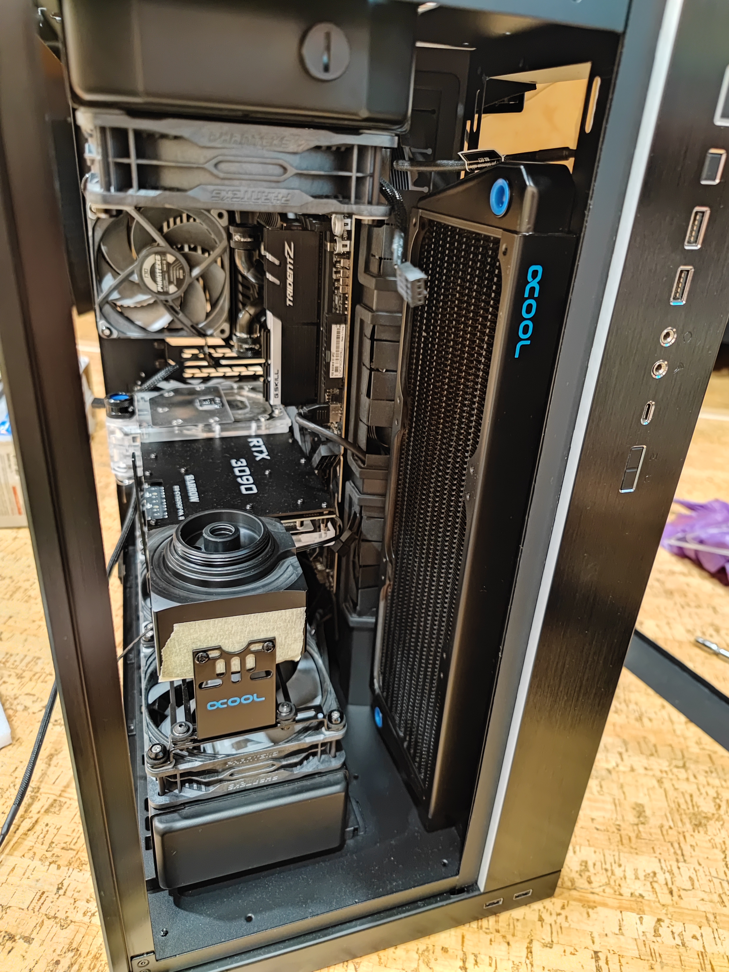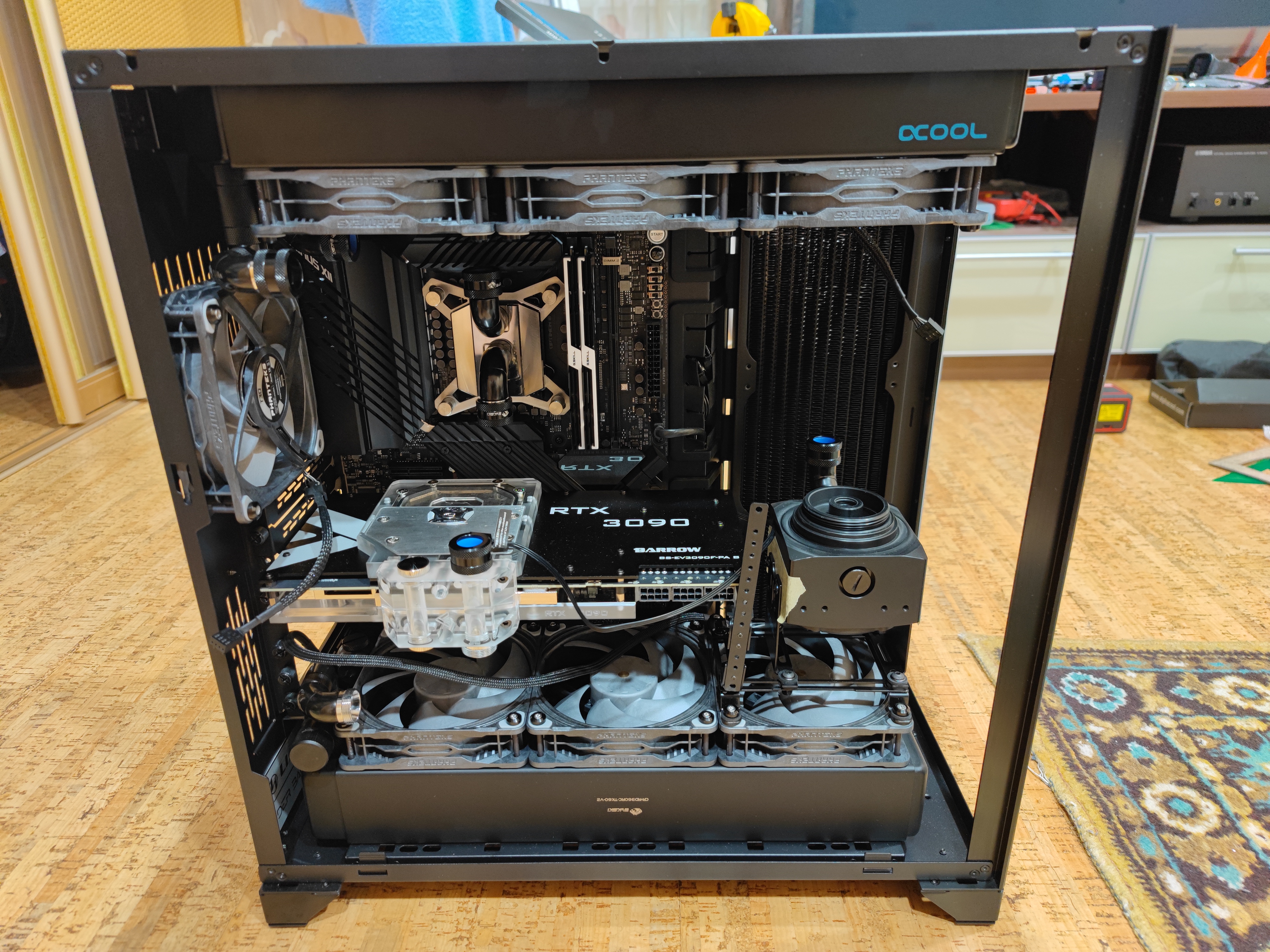 Ну два толстых 360 радиатора для 3600х+5700xt... В играх потребление 200-250вт. Чего бы там быть плохим температурам.