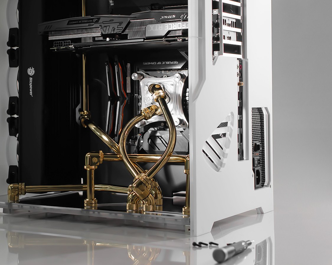 Одним из самых удачных примеров использования фитингов Bitspower в сочетании с медными трубками есть и остается проект Murderbox Prototype 1, проект сочетающий в себе высокий уровень эстетичности и инженерной мысли.