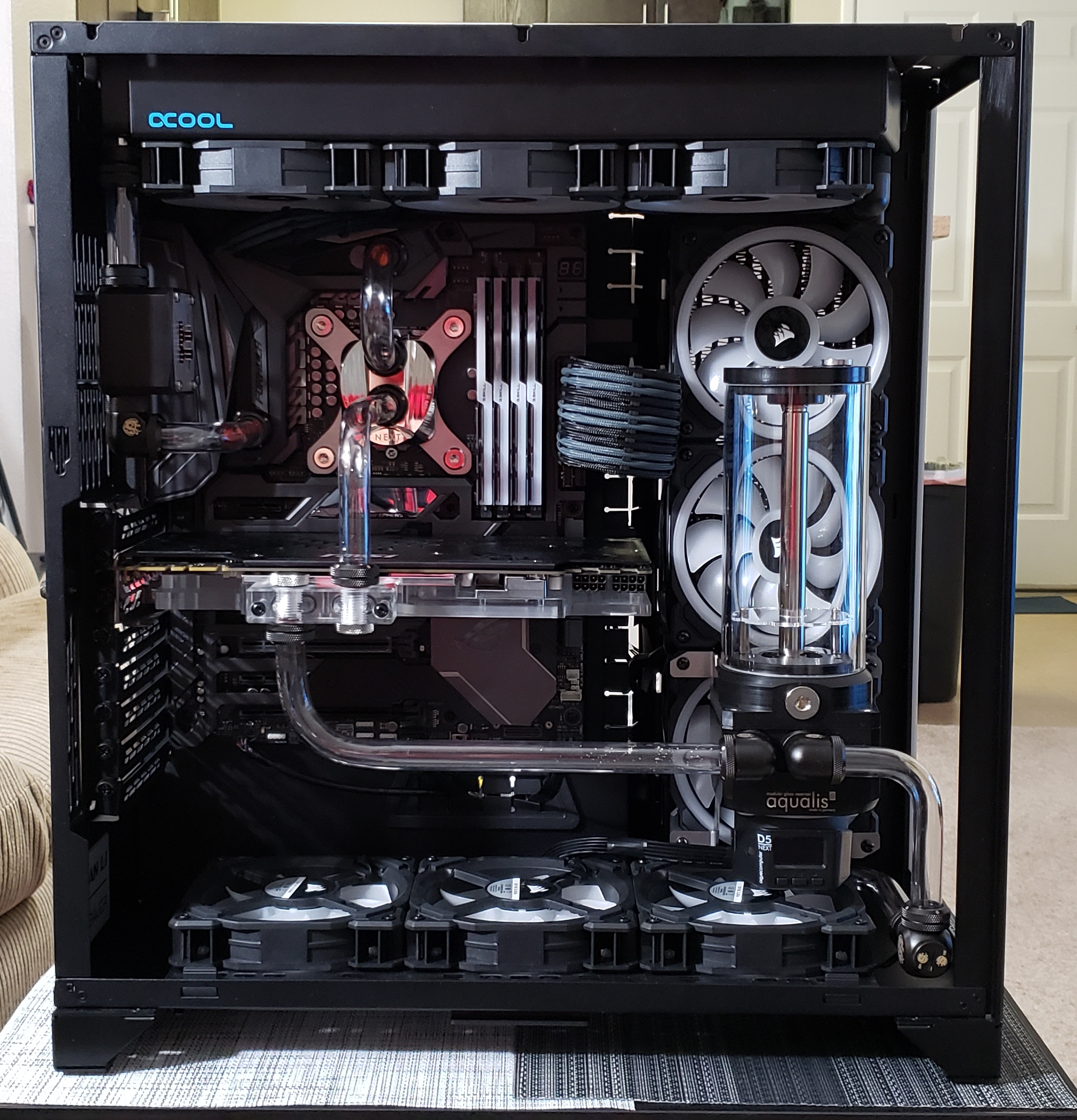 При первом взгляде - впечатляет... количеством трубок и тремя контурами (?) Но. Я тоже предпочитаю медь, но в другом исполнении, имхо. При более внимательном рассмотрении, можно заметить следующее: Целю автора этого проекта было показать , что так можно сделать, но не более того, ибо внутри этого системного блока должно быть адски жарко. Мне интересно было бы увидеть рабочие температуры этой сборки. RAM водоблоки исполняют роль муляжей, т.к не подключены. Не все аккуратно собрано, но при таком хаосе из труб, это не особо бросается в глаза.