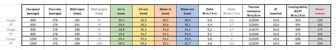 Методика: - стресс-тест AIDA FPU 18 мин. для 600/900/1200 и 10 мин. для max load, вкл. Kombustor; - температуры старта: вода вход (нагретый в радиатор) - ~28°С, воздух вход - ~25°С; - Cougar установлены наверху, GT - посередине.