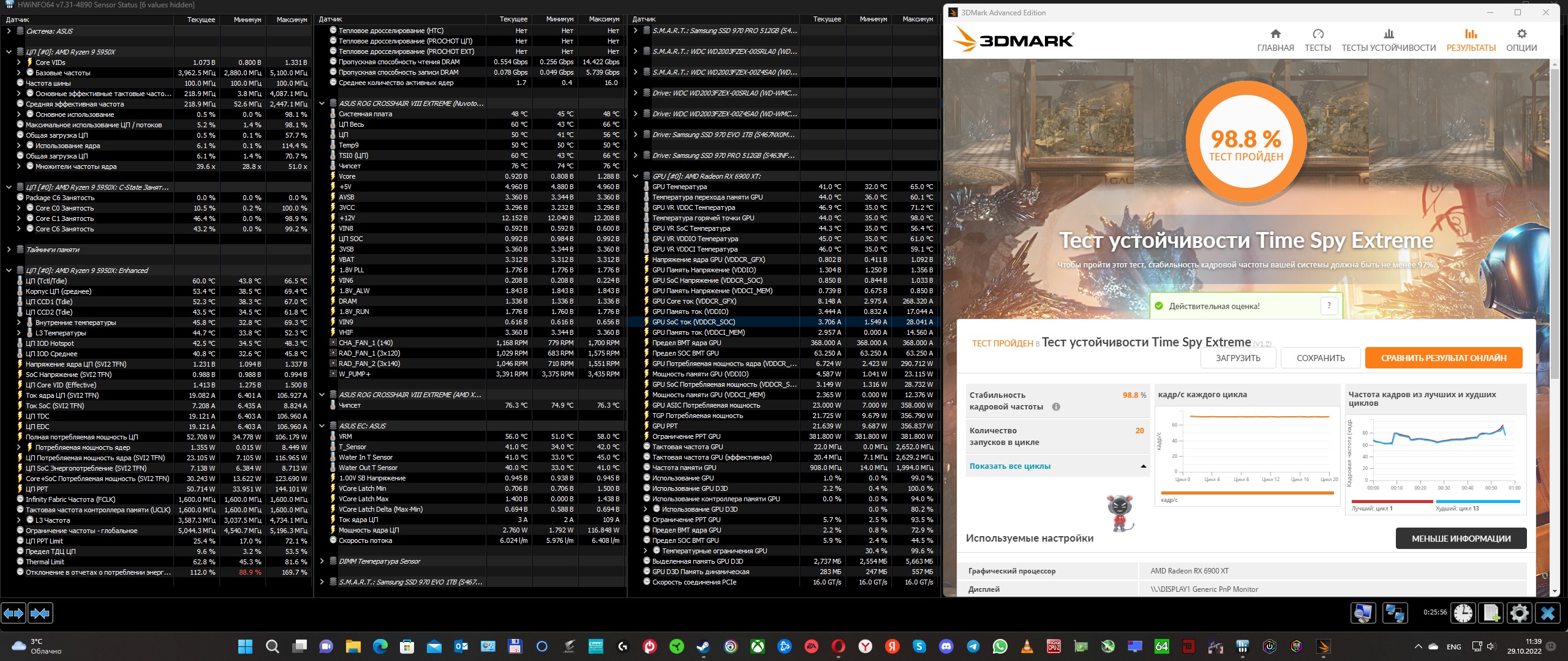 Продолжаем. Температура в помещении 28 градусов. t жидкости в радиаторе 32c (жидкость пропиленгликоль 55%) Установлены вентиляторы: Aerocool Duo 20 200мм + Noname 120мм. Без диффузоров, просто два вентилятора. За вторым 200мм нужно ехать, но мне было лень куда то выезжать. cpu настройки дефолтные, gpu 2500/2100 1145mV Третья минута, t контура 38c. Пятая минута, t контура 40c Седьмая минута, t контура 42c Десятая минута, t контура 44c Тринадцатая минута, t контура 45c 16я минута теста, температура в помещении 29c, контур 46c. Продолжать было не интересно.