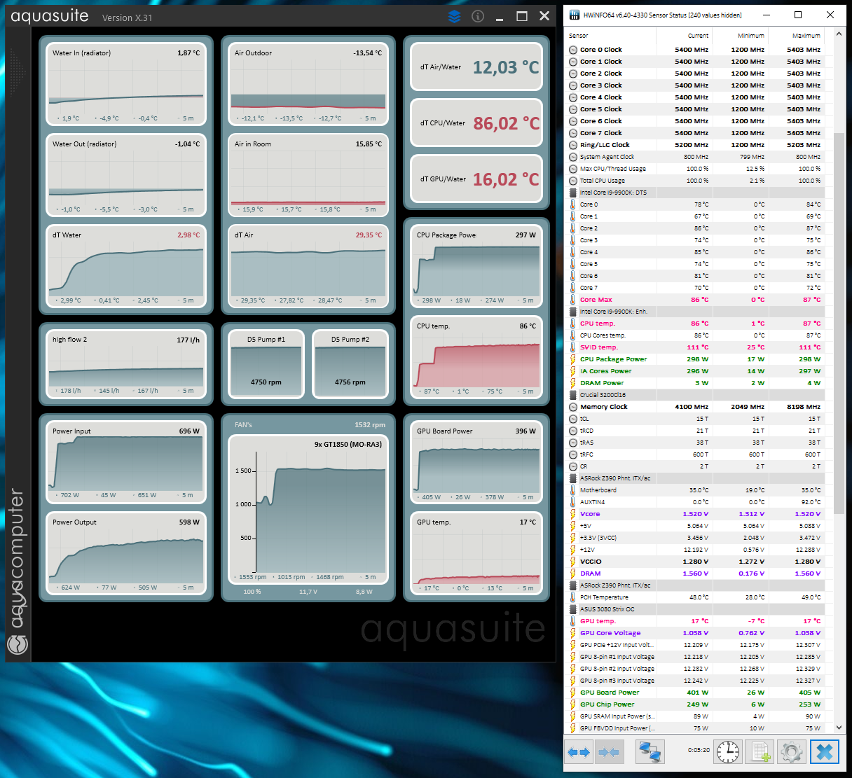 Ну хотя бы метро на максималках. Почему карта так задушена 1845/0.887 ? Если уж на воду ставить, то и гонять надо с упорами в лимит и на нормальных частотах, иначе смысла в воде ноль. С такими напряжениями/частотами да еще и при 21 градусах в комнате, тут и с воздушным охлаждением градусов 50 максимум будет.