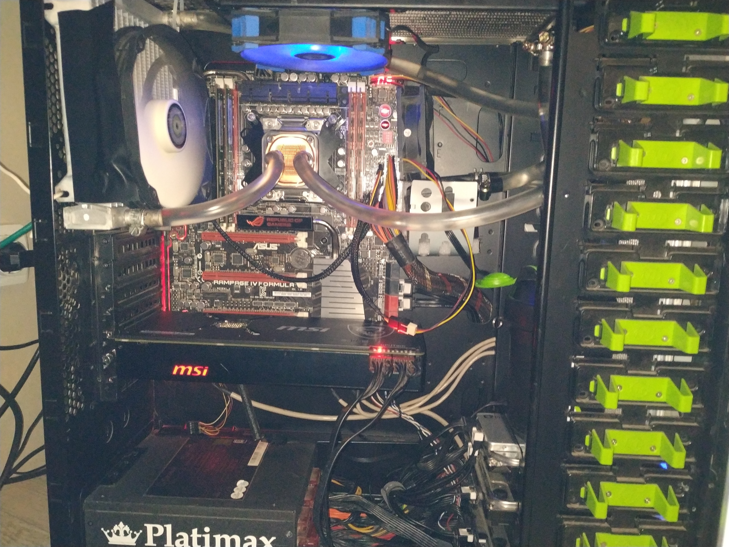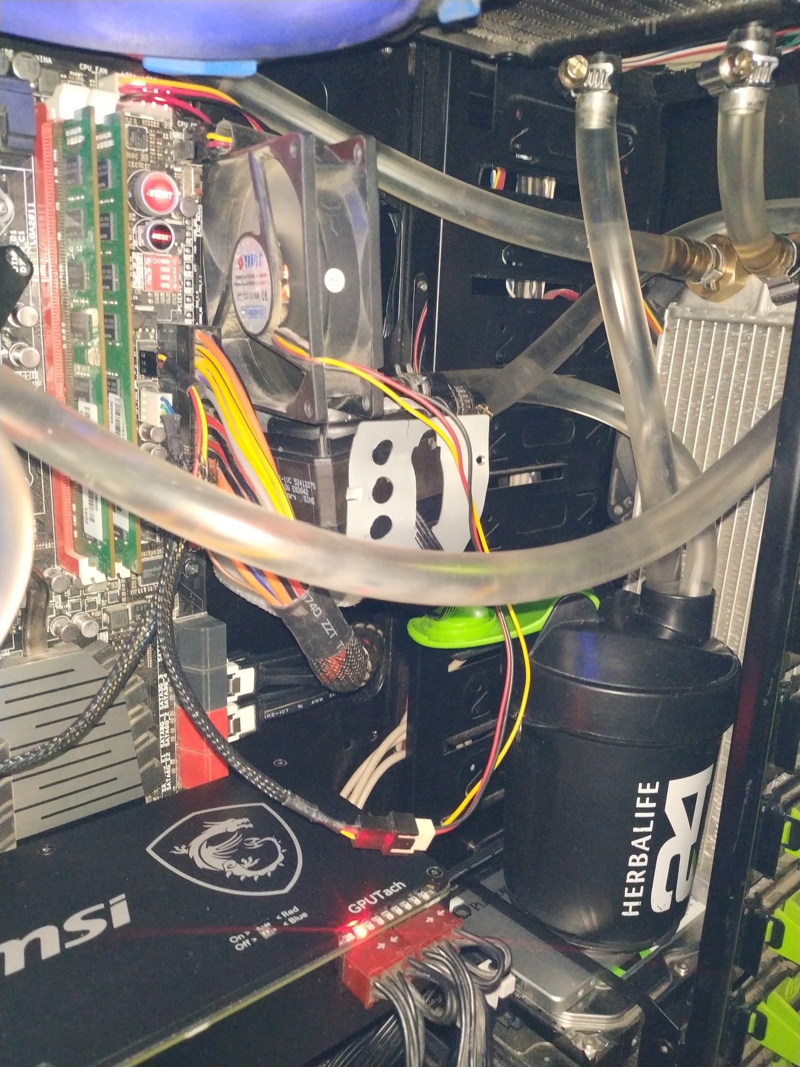 Laing DDC-1 прямо из того самого мака, откуда они и пошли Радиатор от мака, радиатор от печки, радиатор от Corsair H100. Шланги 10/14 Ватерблок с алика, с гнутыми креплениями Питьевая вода
