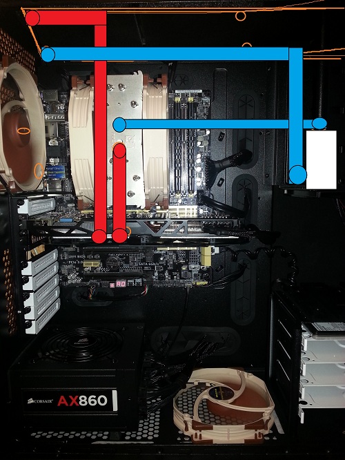 Мостик пришлось все-таки рассверлить из последовательного в параллельный (чего зря шланги и тройники тратить) + сточить немного сверху где вход. Шланги до верхнего радиатора неоптимальны, буду переделывать точно, сейчас нехватает радиуса и жесткости завернуть напрямую между радиаторами. Закажу новых фиттингов и более тонкий (13/10) шланг. Уже когда все собрал и сутки отстоял на тесте на протечку, когда запустил, понял что вентилятора обдувающего ВК недостаточно - VRM сильно горячие. Решил раздербанить штатный охлад одной карты и прицепить по вентилятору на каждую, благо контакты рядом и управление есть. По-моему вполне нормально вышло.