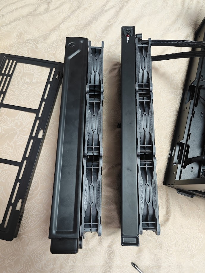 Ребят подсоветуйте куда копать, есть алю задняя стенка корпуса, есть радик 60мм толщиной альфакул и кулеры ноктуа 120ки две штуки. Кулеры были вставлены в спец.полку от корпуса, сверху на них прикручен радик был, все горизонтально, получался сэндвич 80мм толщиной где-то. Сейчас поменял сетап с помпой и резиком, и нехватает 1см сверху корпуса чтобы это все взгромоздить, а снизу как раз есть эти два сантима, но сендвич из радика и кулером в текущем виде никак не приспособить с креплением к задней стенке, нужна другая полка или крепление типа Г или L образное под эту, кароче чтобы можно было закрепить эту конструкцию выше, чем она сейчас крепится. Заднюю стенку понятно, просверлю. Есть полки для крепления 240 на али от bykski и barrow, задняя стенка на одной 45мм на другой 35мм, а у меня 80мм получается только задняя толщина этой конструкции. Боюсь радик не встанет, винты будут мешать.