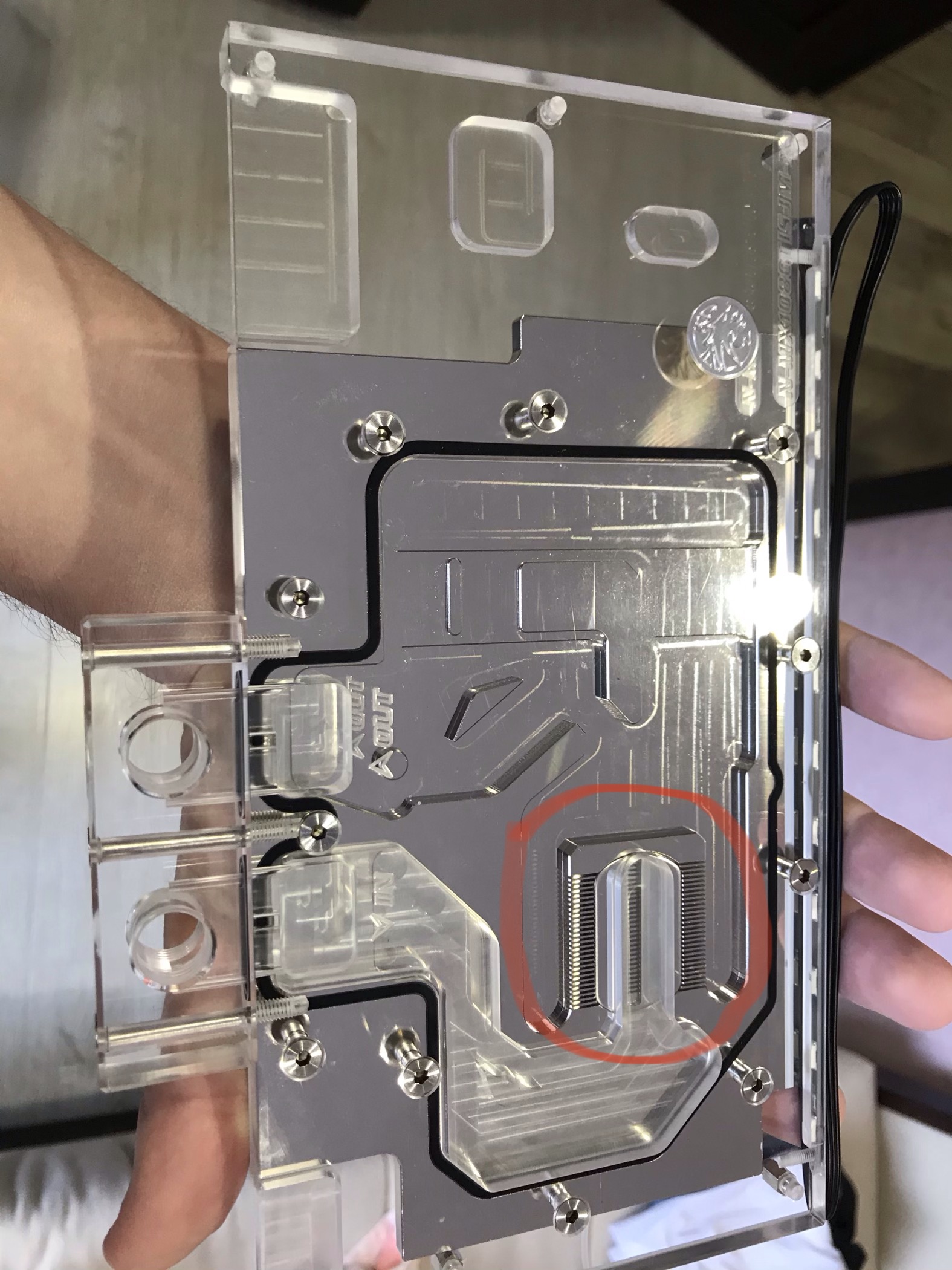 Вот. Звук идёт, вроде, оттуда (обвёл). Не думаю что это копия конкретной модели EK, поскольку на мою видеокарту (palit gtx1080ti gamerock premium edition) водоблок есть только у bykski (остальные водоблоки и резервуар с помпой заказал watercool, радиаторы hw labs, шланги mayhems, фитинги barrow, но тут выбора не было).