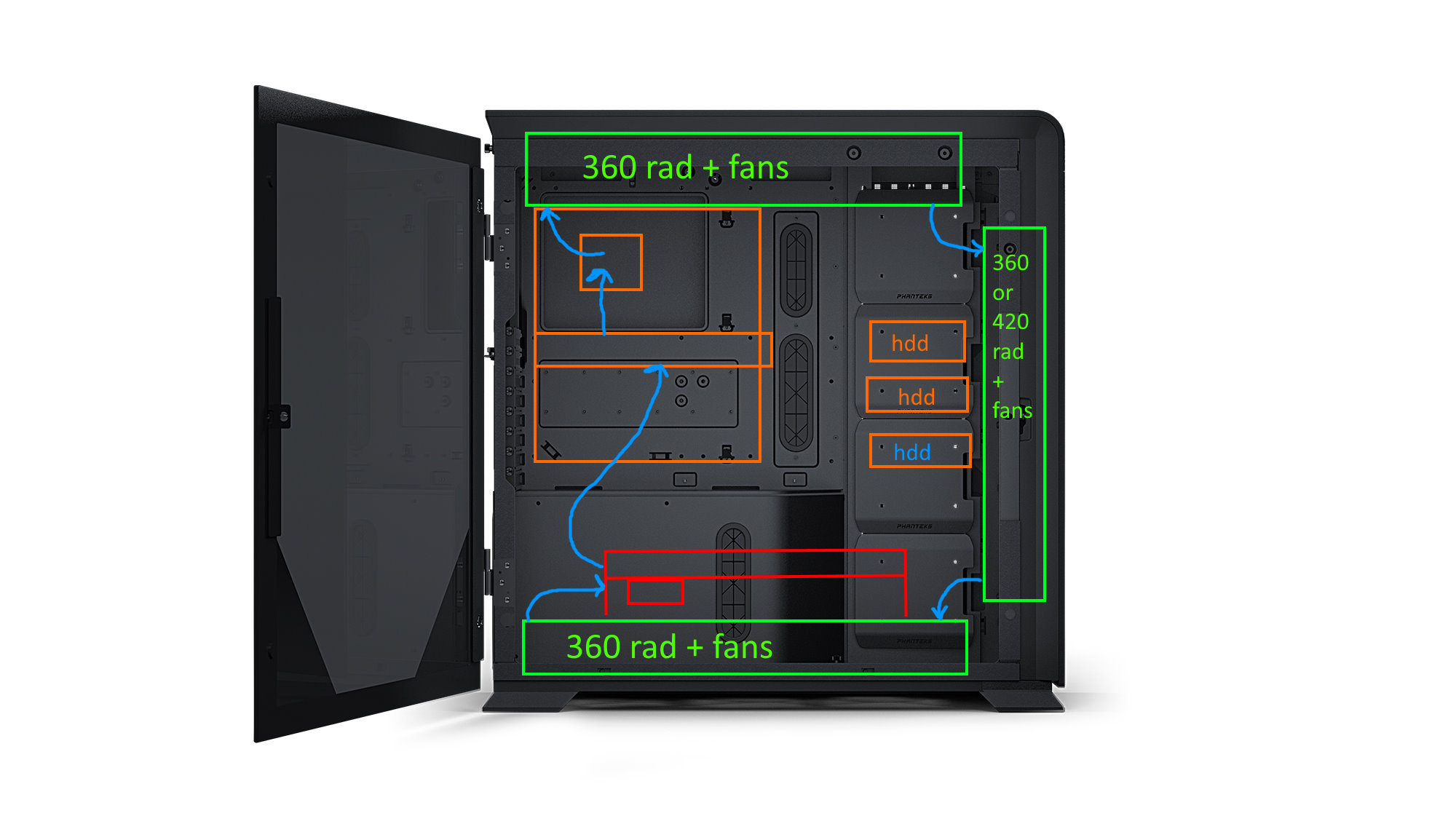 Я вот всё в голове прикидываю схему для переезда в корпус Phanteks Enthoo Pro II, когда выйдет(и если вечнодеревянный не уйдёт в дальнейшие пике), но возникает вопрос какой резервуар выбрать? Проблема в наличии HDD, установка которых отъедает место. а) Если ставить вертикальный рез, то максимум войдёт на 100-150мл, но я не знаю насколько будет булькать в таком случае жидкость, учитывая небольшой объём. Хотя вполне возможен вариант, чтобы снизу поставить рад на 240 вместо 360 и выиграть для реза дополнительные 55мм по высоте. б) Можно также закрепить горизонтально, вопрос остаётся таким же (ну, для доливки жидкости наклонять корпус, но это мелочи) + не знаю насколько там критичен уровень воды, чтобы помпа была постоянно погружена в жидкость. в) Склоняюсь к варианту с distro plate по типу EK-Quantum Kinetic FLT. Изобразил примерный вариант схемы с таким резом (фронтального рада скорей всего не будет, он наверно и не залезет). Но получается, что заливать жидкость нужно до самого краю, и куда тогда расширяться жидкости при нагреве? Как вариант нашёл прям очень похожую сборку, но тут закреплено по-другому и в принципе вопрос с контролем уровня жидкости отпадает, хотя для такого крепежа надо будет пересверливать крепления. Что посоветуете? Какой вариант лучше рассмотреть или возможно пересмотреть схему контура?