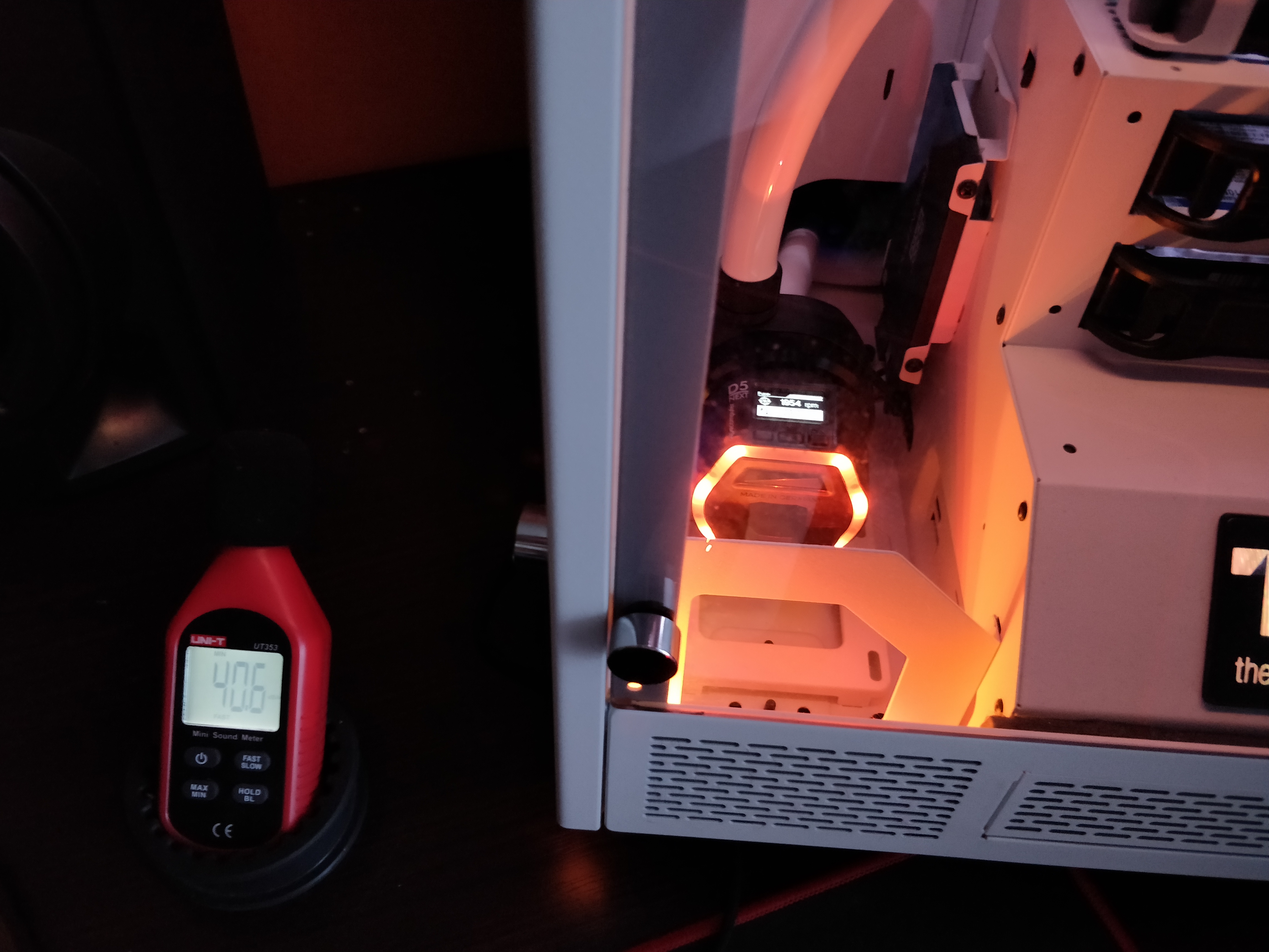 Менялись только обороты помпы и всё. Понятно что там фон от остального компа, погрешности и т.п., но уверяю что такое соотношение фиксируется от замера к замеру. Фоновый уровень (условная тишина) 37,7дБА. 3000 - золотая середина. Левитация импеллера надёжная, поток достаточный для многих контуров.